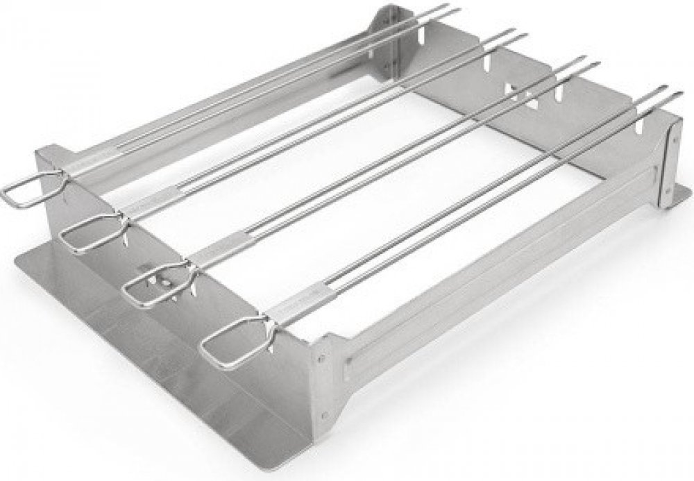 Nerezový stojánek s dvojitými jehlami zajišťuje stabilitu během manipulace a otáčení špízů. Jehly i stojánek