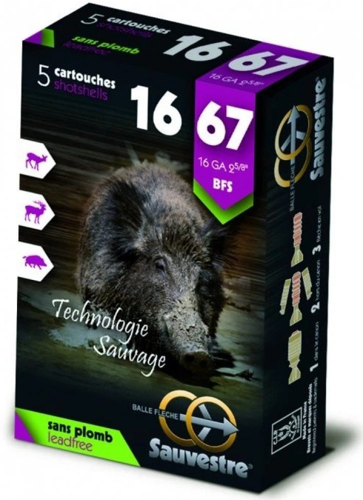 Balení 5 ks prémiového brokového střeliva od francouzského výrobce Sauvestre. Každý náboj obsahuje podkaliberní jednotnou střelu BFS (Balle Fleche Sauvestre = šípová střela Sauvestre) ze slitiny s polymerovým stabilizátorem a sabotem.