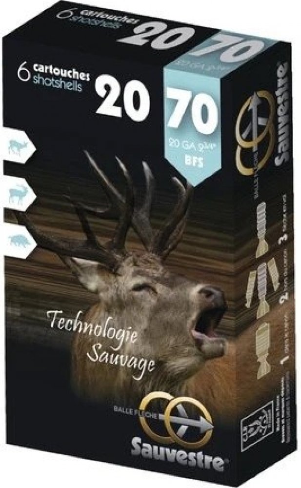 Balení 6 ks prémiového brokového střeliva od francouzského výrobce Sauvestre. Každý náboj obsahuje podkaliberní jednotnou střelu BFS z olova s polymerovým stabilizátorem a sabotem.