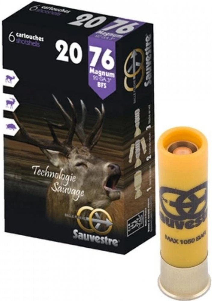 Balení 6 ks prémiového brokového střeliva od francouzského výrobce Sauvestre. Každý náboj obsahuje podkaliberní jednotnou střelu BFS z olova s polymerovým stabilizátorem a sabotem.