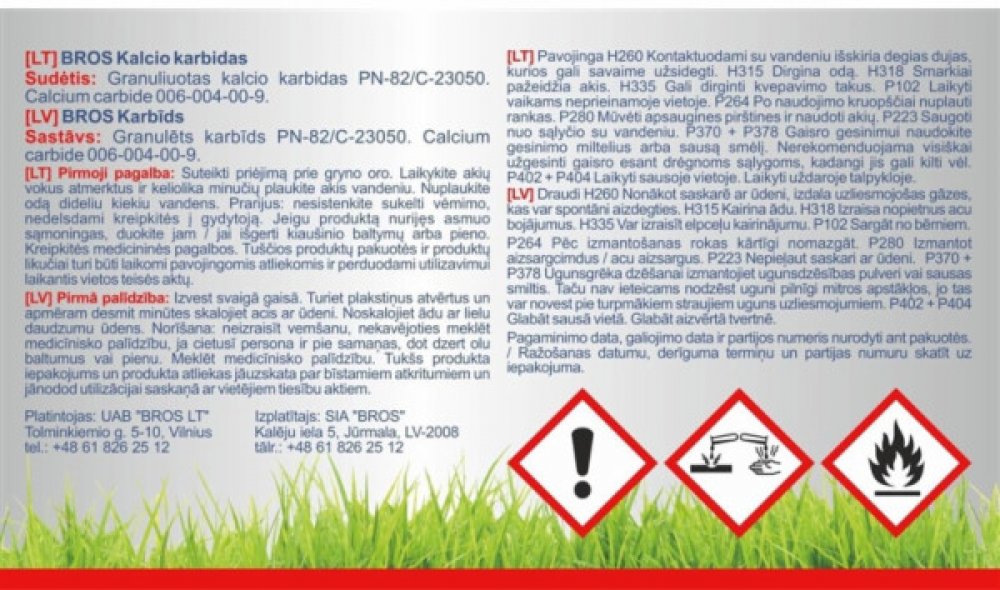 Přípravek používejte v souladu s návodem na obalu, dodržujte základní pravidla bezpečnosti práce s chemickými přípravky. R11 Vysoce hořlavý. R15 Při styku s vodou uvolňuje extrémně hořlavé plyny; S2 uchovávejte mimo dosah dětí; S8 Uchovávejte obal suchý; S20/21 Nejezte, nepijte a nekuřte při používání; S37 Používejte vhodné ochranné rukavice; S43 V případě požáru použijte suché hasící prostředky. Nikdy nepoužívat vodu; S46 Při použití okamžitě vyhledejte lékařskou pomoc a ukažte tento materiál a jeho obal nebo označení. S56 Zneškodněte tento materiál a jeho obal ve sběrném místě pro zvláštní nebo nebezpečné odpady.