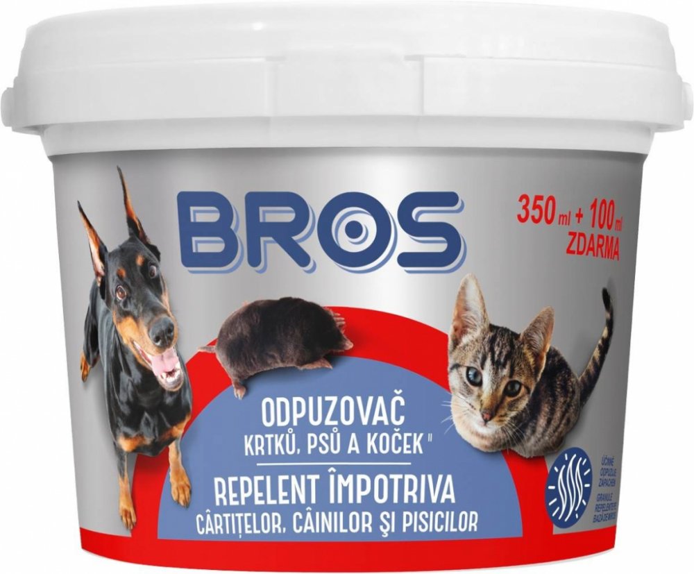 Ideální ochrana zahrada a dětských hřišť. Umožňuje předcházet vzniku nebezpečných hromádek a exkrementů na cestách, alejích stezkách apod. a také chrání dětská hřiště před exkrementy psů a koček. Pach účinně odpuzuje zvířata, ale není obtížný pro člověka. Přípravek v podobě prášku. Návod k použití:Krtci: Odkryjte část podzemní chodby krtka a vsypte do ní několik lžic přípravku (5 lžic je asi 20 g). Poté utěsněte otvor tak, aby pak bez problému pronikal dále chodbami. Je možné také posypat celou plochu počínaje od středu a vždy po několika dnech ošetřenou plochu rozšiřovat (2 lžíce na 1 m2).Psi a kočky: K zajištěnní ochrany plochy vysypte 2 lžíce přípravku na 1 m2 plochy. V místech zvláště vystavených znečišťování zvířat lze vysypat větší možství produktu. Za příznivých podmínek (menší množství srážek) je přípravek účinný asi 2 měsíce.Způsob použití: K použití proti krtkům vyskytujících se na letišti, zemních hydrotechnických konstrukcích a sportovních objektech. Přípravek přechovávejte v originálním, těsně uzavřeném obalu v suchém místě.Bezpečnostní opatření: Před použitím si přečtěte návod k použití na obalu a přípravek používejte v souladu s návodem. Dodržujte základní pravidla bezpečnosti práce s chemickými přípravky. Při používání přípravku nejezte, nepijte a nekuřte, po ukončení práce si umyjte ruce. Škodlivý pro vodní organismy, může vyvolat dlouhodobé nepříznivé účinky ve vodním prostředí. uchovávejte mimo dosah dětí. Zamezte styku s očima a kůží. při požití okamžitě vyhledejte lékařskou pomoc a ukažte tento obal nebo označení.