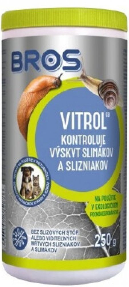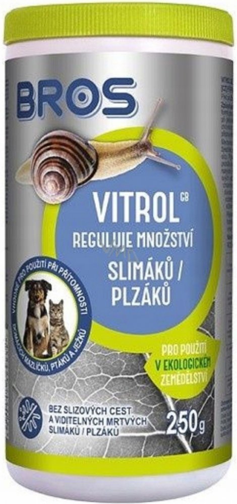 Bros Vitrol jsou velmi účinné granule proti slimákům. Účinnou látkou je difosforečnan železitý, který je velmi účinný a současně velmi bezpečný. Snižuje tvorbu slizu a tím ihned zastavuje ožírání rostlin. Slimáci po požití nástrahy mají pocit nasycení a z toho důvodu se stahují do svých úkrytů kde hynou. Na ploše tak nezůstávají ani mrtví slimáci.