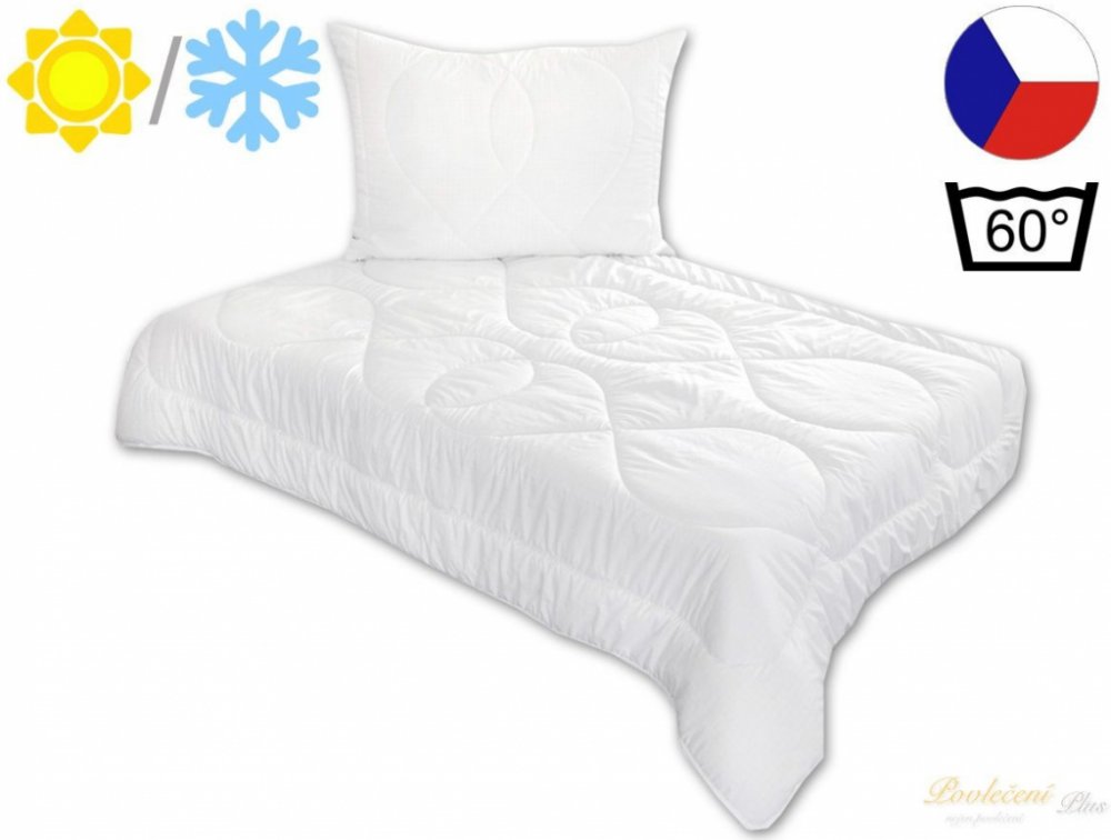 Souprava LUXUS PLUS obsahuje přikrývku 140x200 cm o gramáži vnitřního výplňového materiálu 850g a polštář 70x90cm s výplní 700g kuličkového vlákna. Přikrývka je vhodná pro jarní a podzimní období nebo pro celoroční užívání. Polštář je opatřen zipem, pro možnost doplnění či odebrání části výplně dle potřeby zákazníka. Přikrývka i polštář obsahují plně protialergické duté vlákno.