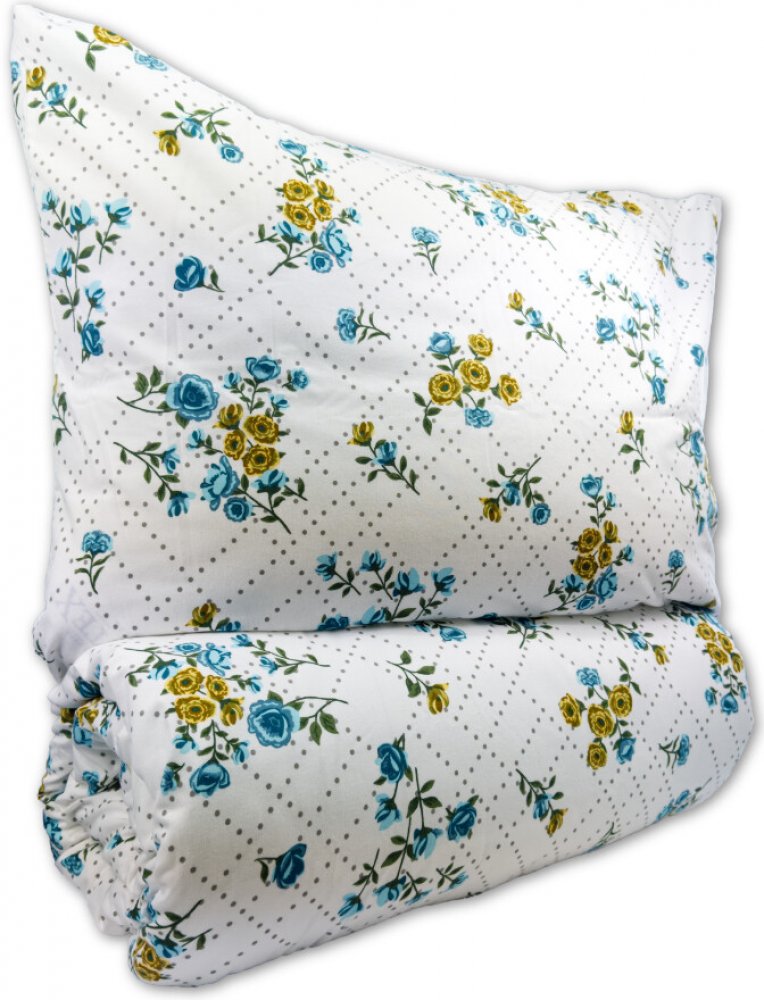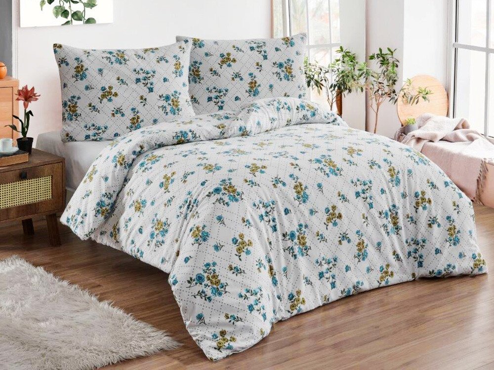 Toto povlečení zaujme svým sofistikovaným florálním vzorem, který kombinuje jemné motivy modrých a žlutých květin s pravidelnou mřížkou drobných teček. Elegantní uspořádání na světlém podkladu vytváří vyvážený a vkusný design, který do ložnice vnese klid, harmonii a nádech venkovské noblesy.
