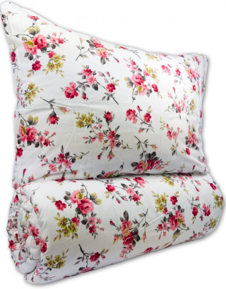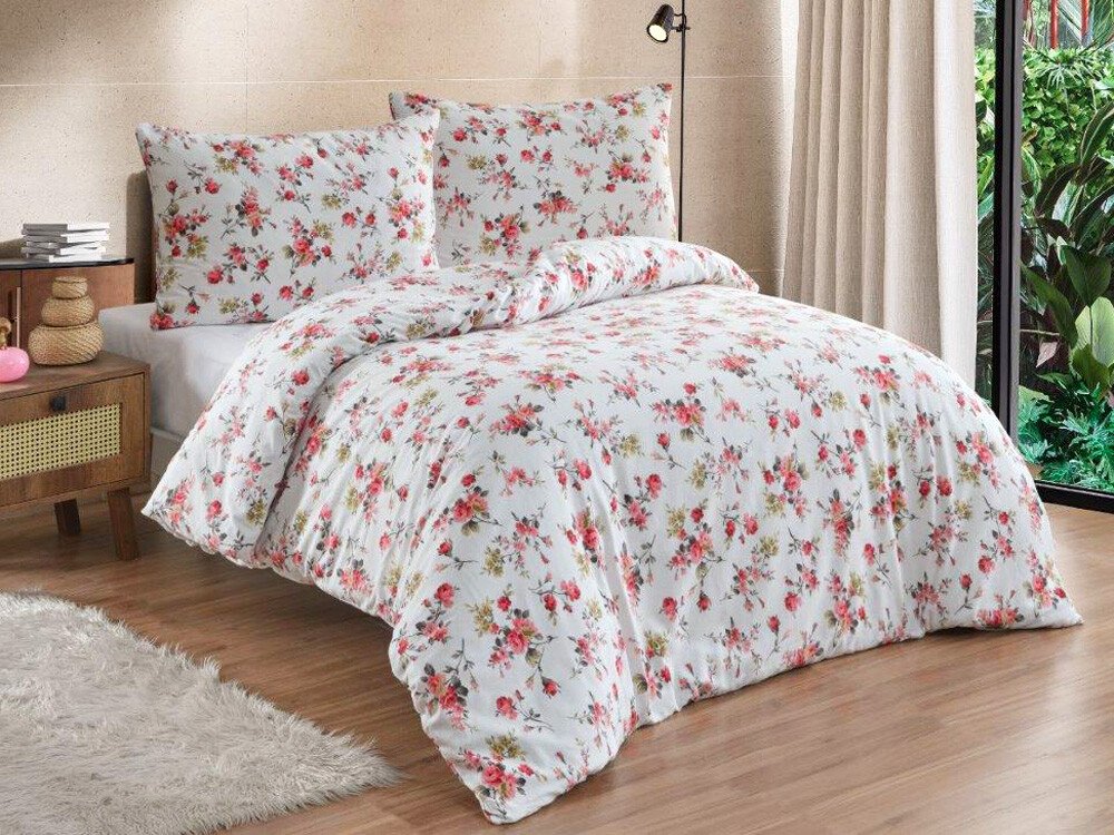 Povlečení zdobí romantický, hustě rozesetý květinový potisk. Na krémově bílém podkladu se v nepravidelných shlucích objevují drobné růžové až malinové růžičky, doplněné o pískově žluté kvítky a jemné hnědavé větvičky s lístky. Květiny se liší velikostí – od miniaturních poupátek po plnější, rozevřené hlavičky – což vzoru dodává živost a přirozenou dynamiku, jako by šlo o romantickou letní louku na...