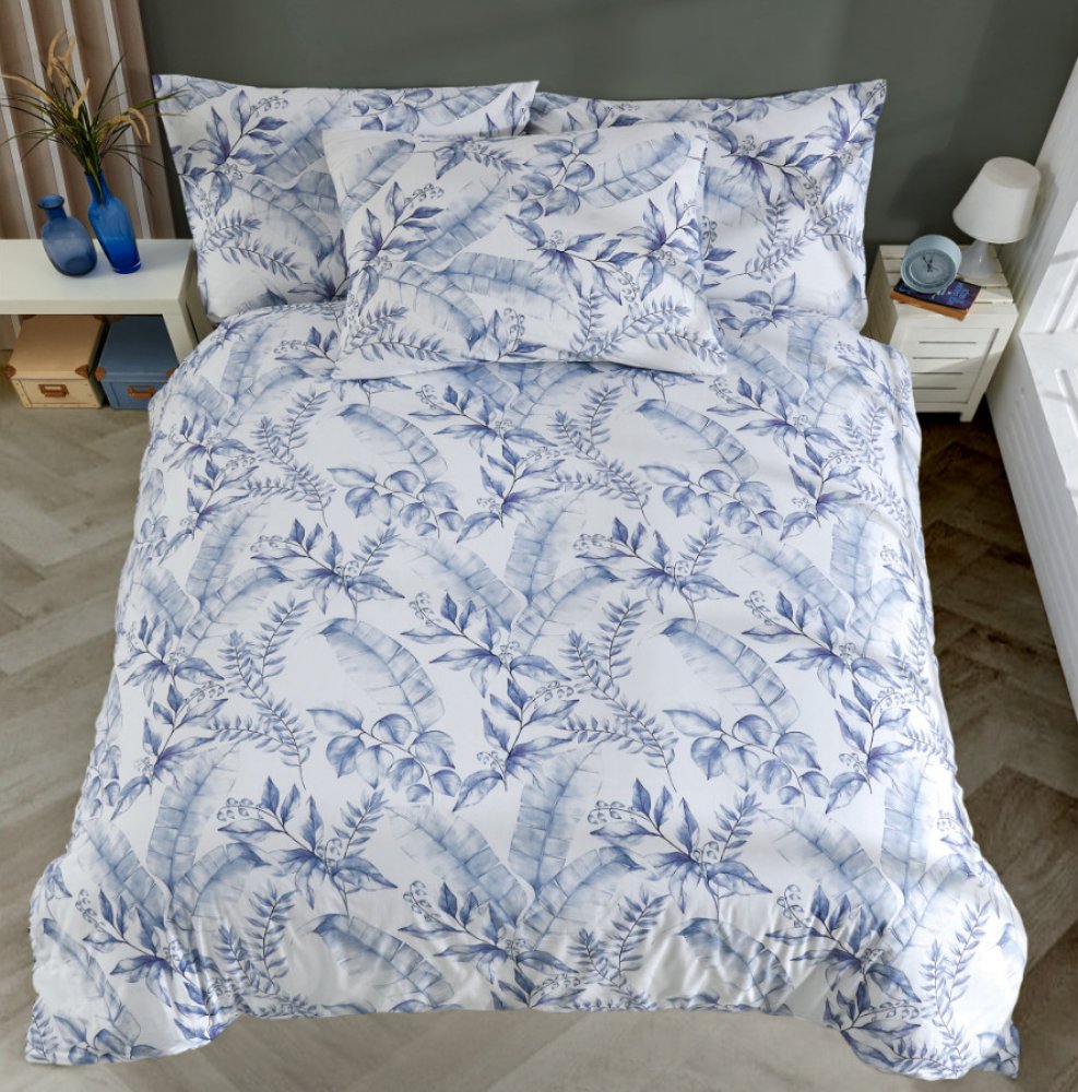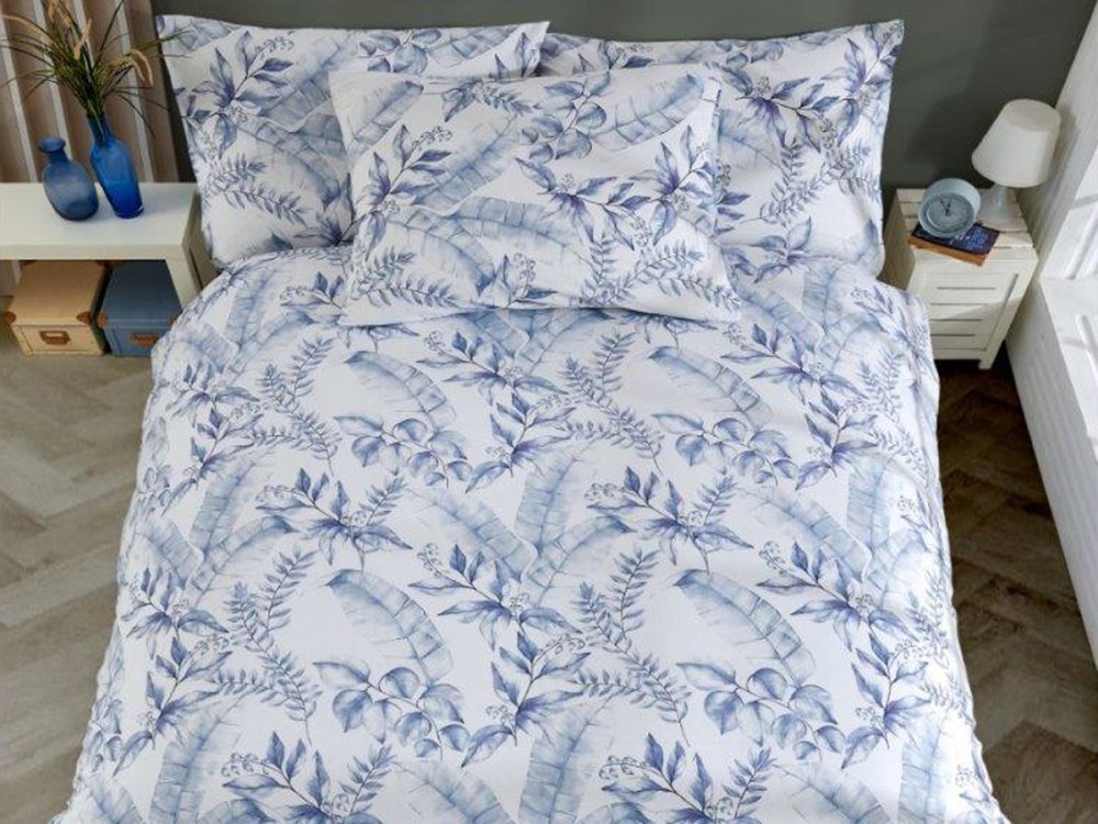 Bavlněné povlečení s elegantním a jemným modrým vzorem na bílém podkladu. Vzor zahrnuje motivy rostlin, zejména listů a květů, které vypadají jako jemně kreslené akvarelem. Povlečení působí svěže a elegantně, hodí se do moderně zařízené ložnice.