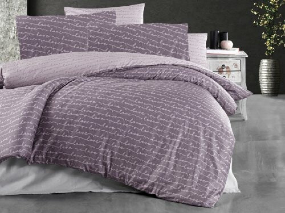 Ložní povlečení s elegantním a moderním designem. Povlečení má šedorůžový podklad a je zdobené růžovošedým nápisem „love“, který se opakuje v řadě po celé ploše. Písmo je psané ladným, ručně psaným st