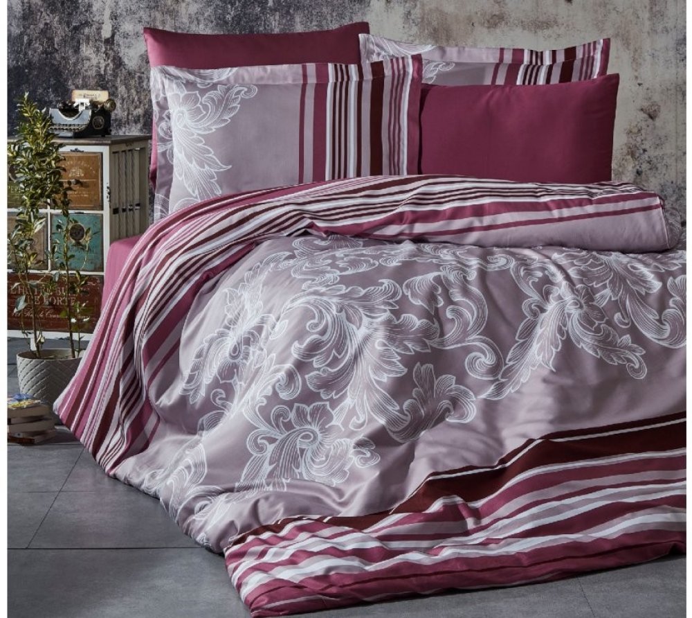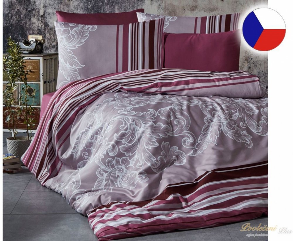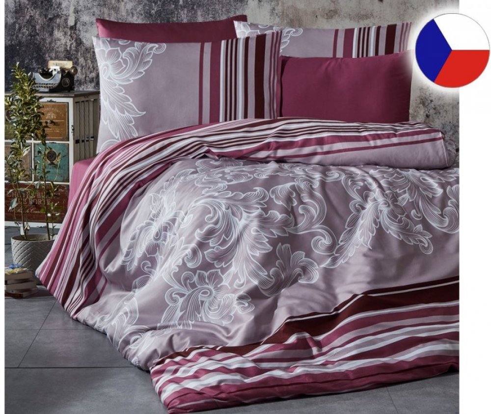 Nádherný povlak Sonet je laděný do starorůžového a bordó odstínu. Vzor listů je vykreslen v bílé barvě na světle starorůžovém podkladu a krásně doplňuje různě široké pruhy v odstínech barev vínové, ostružinové a bílé.