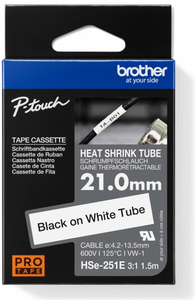 HSE-251E - NOVÁ originální bužírka, smrštitelnost 3:1, šířka 21,0 mm, černý tisk na bílé, délka 1,5 m z řady PRO Tape (design černo-modrého balení)