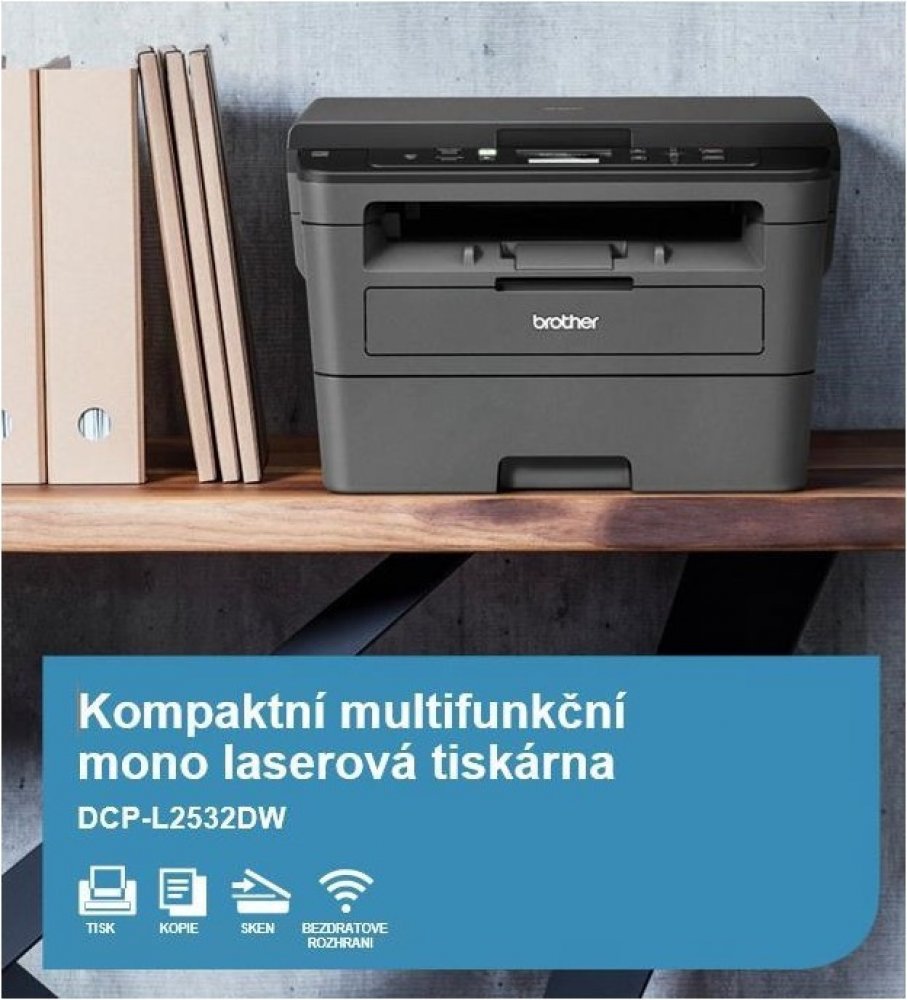 Cenově dostupná tiskárna DCP-L2532DW je vhodná ke stolním počítačům. Je kompaktní a tiskne tiše při práci.