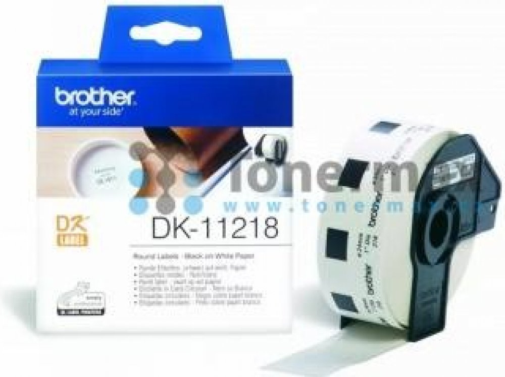 Brother DK-11218, bílá páska / černý tisk, výtěžnost 1000 ks / kulaté ∅ 24 mm. Pro tiskárny Brother QL-500, QL-500A, QL-500BW, QL-550, QL-560, QL-560VP, QL-570, QL-580N, QL-600, QL-600B, QL-600G, QL-600R, QL-650TD, QL-700, QL-710W, QL-720NW, QL-800, QL-810W, QL-810Wc, QL-820NWB, QL-1050, QL-1050N, QL-1060N, QL-1100, QL-1110NWB