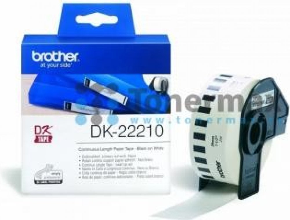 Brother DK-22210, bílá páska / černý tisk, výtěžnost délka 30,48 m / filmová role šířky 29 mm. Pro tiskárny Brother QL-500, QL-500A, QL-500BW, QL-550, QL-560, QL-560VP, QL-570, QL-580N, QL-600, QL-600B, QL-600G, QL-600R, QL-650TD, QL-700, QL-710W, QL-720NW, QL-800, QL-810W, QL-810Wc, QL-820NWB, QL-1050, QL-1050N, QL-1060N, QL-1100, QL-1110NWB