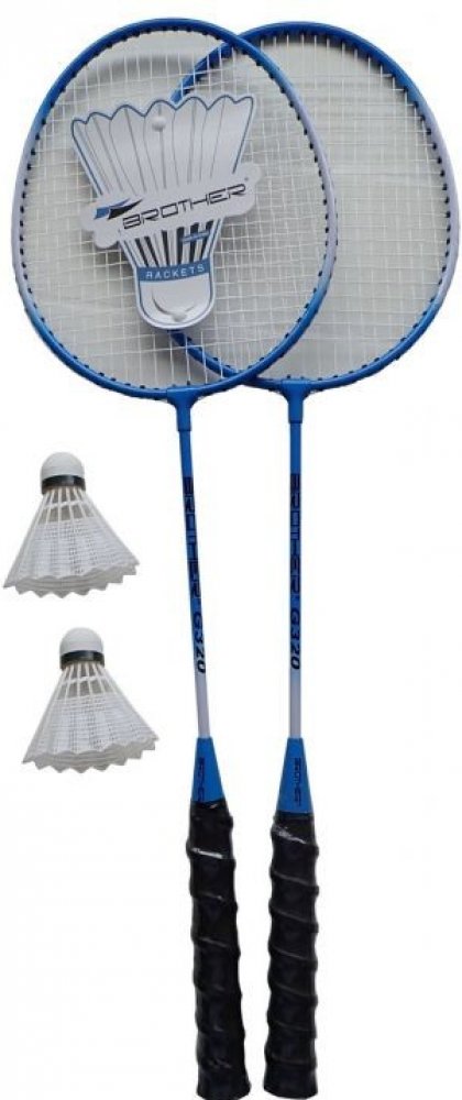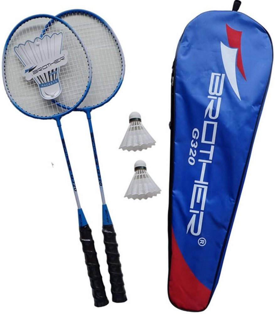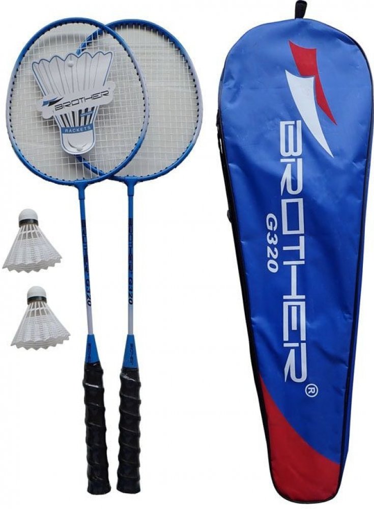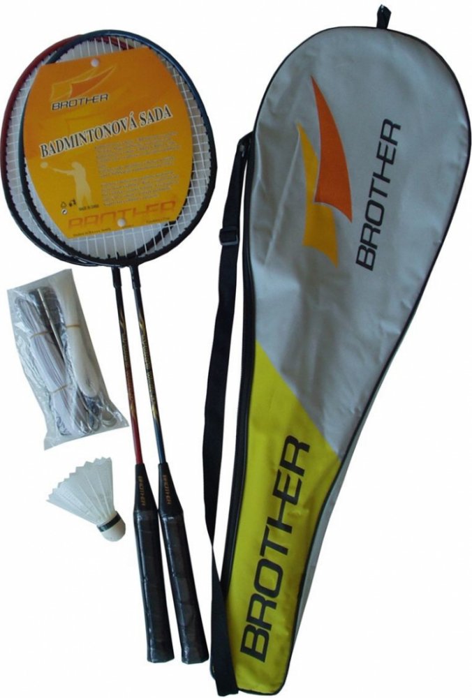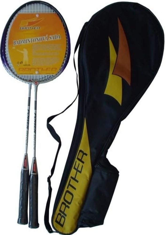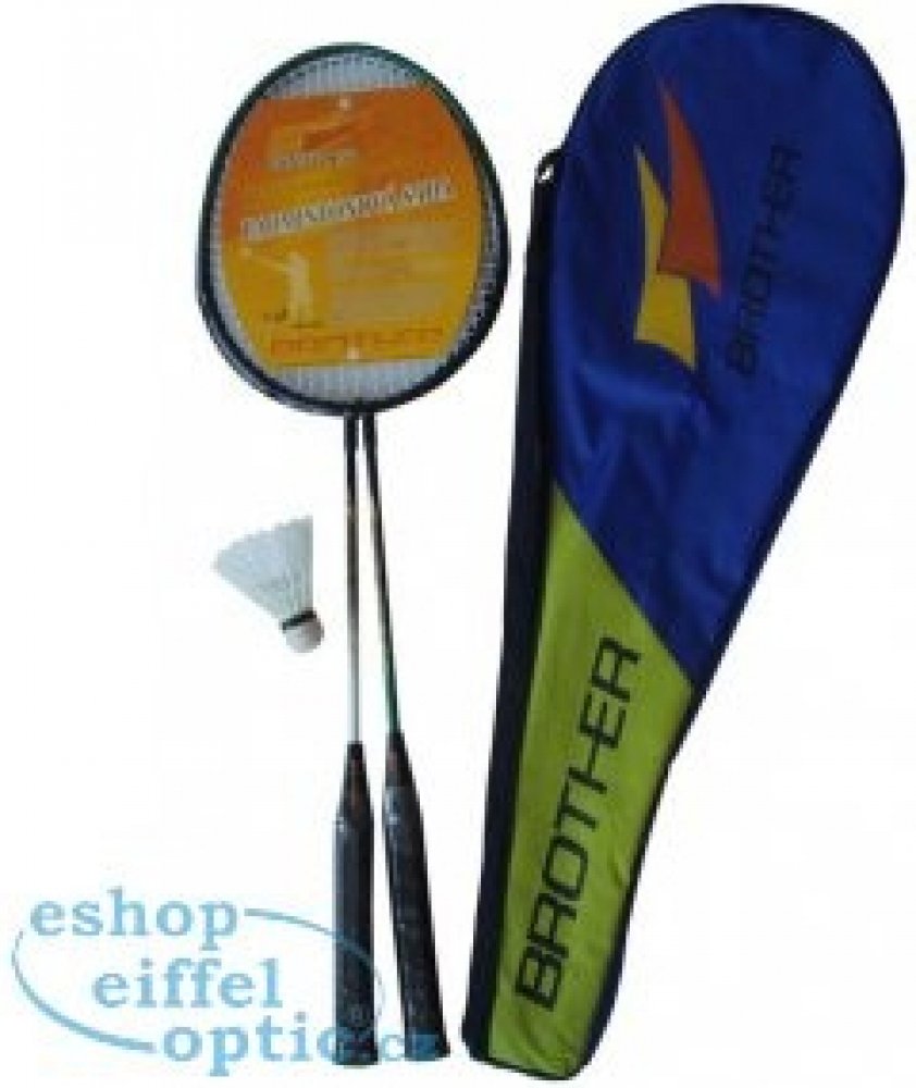 Dvě ocelové pálky s plastovými průchodkami pro ochranu výpletu, pevný výplet, 2 plastové košíčky jako součást badmintonové sady, pouzdro přes rameno, určeno pro rekreační hru.