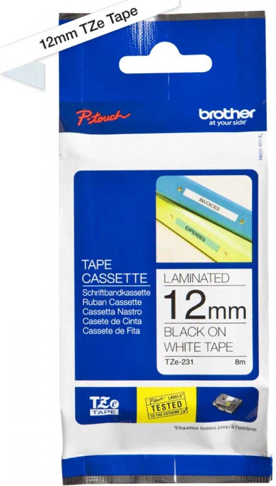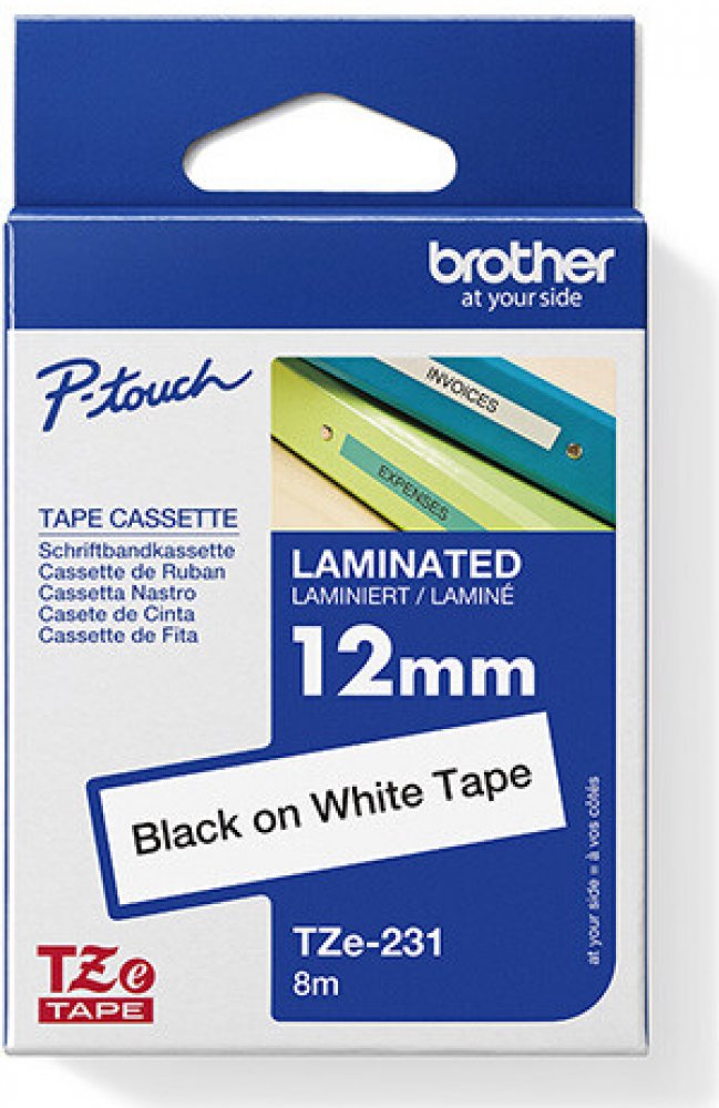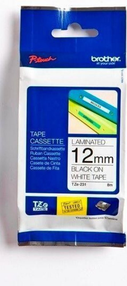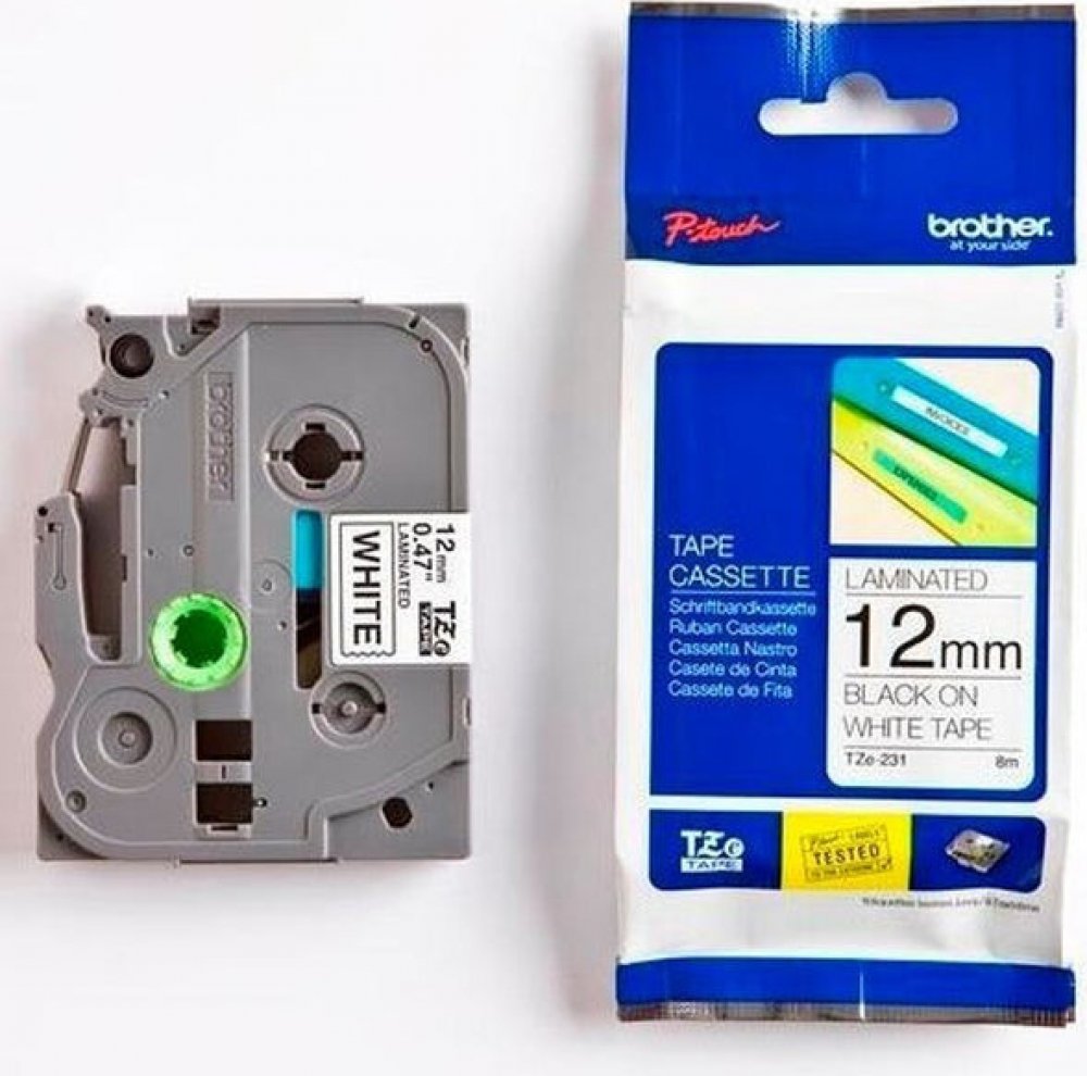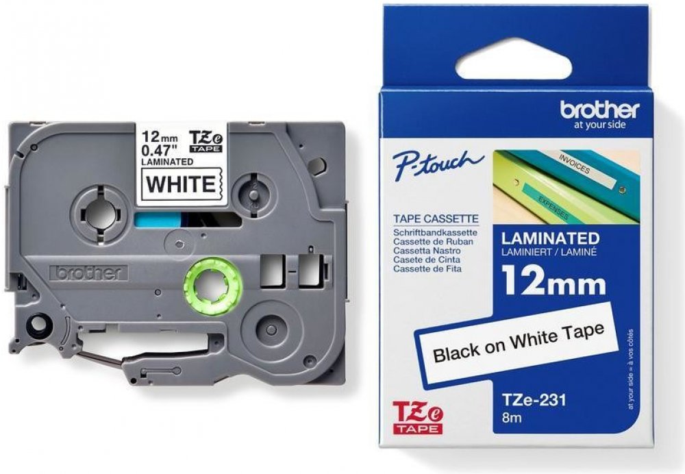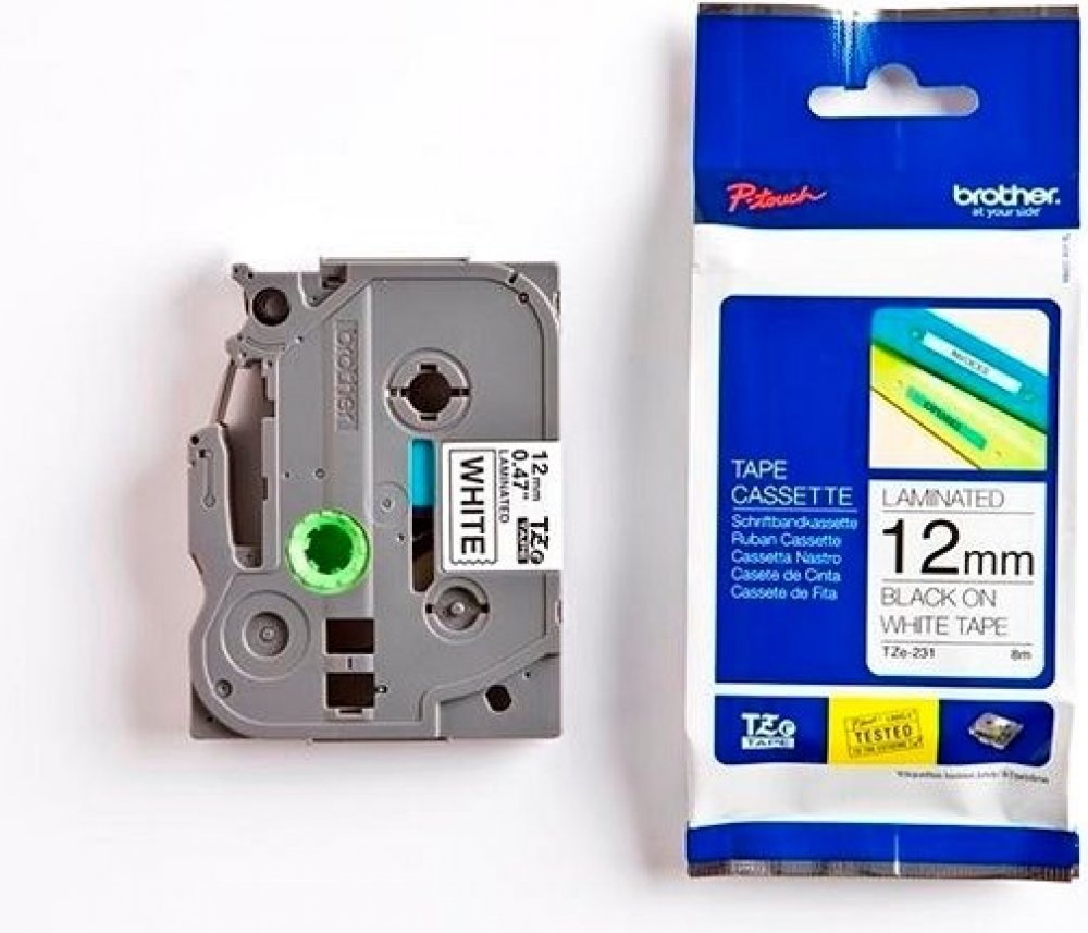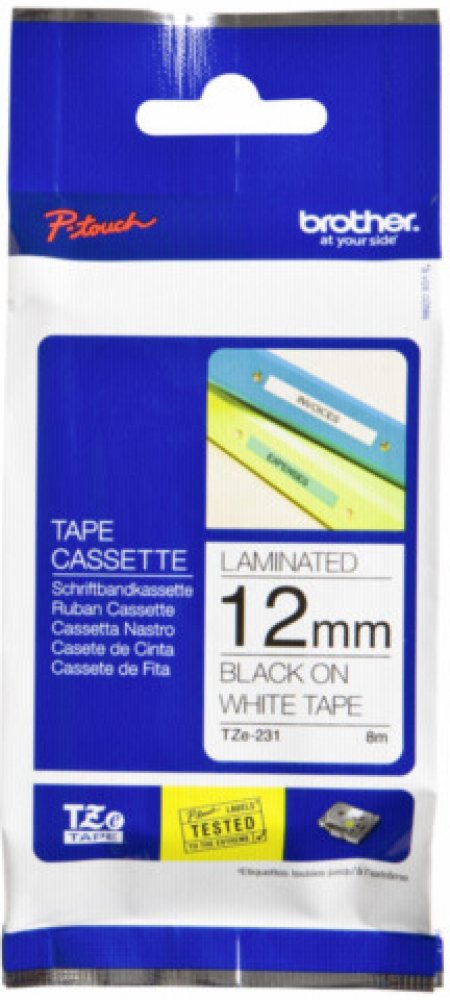 Originální kazeta s páskou TZe-231 je zárukou tvorby snadno čitelného štítku s ostrým textem. Kazeta TZe-231 s laminovanou páskou s černým tiskem na bílém podkladu je stejně praktická v domácnosti, kanceláři či pracovišti. Může být použita k identifikaci obsahu šanonů, regálů až po USB flash disky, značení kabeláže a dalších zařízení. Samolepicí laminované štítky z této kazety byly vyvinuty s důrazem na odolnost proti extrémním teplotám, chemikáliím, oděru, slunečnímu záření a působení vody tak, aby byly vhodné pro vnitřní i venkovní použití. Páska je kompatibilní s tiskárnami štítků P-touch.