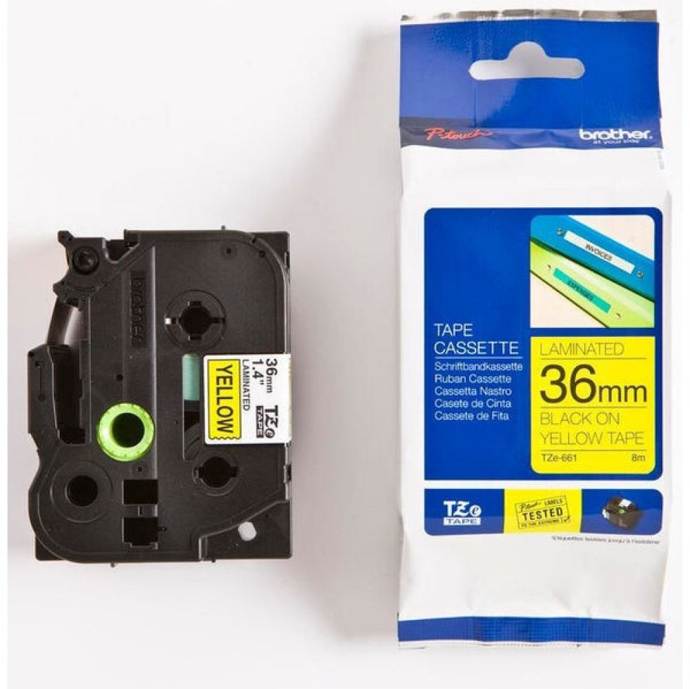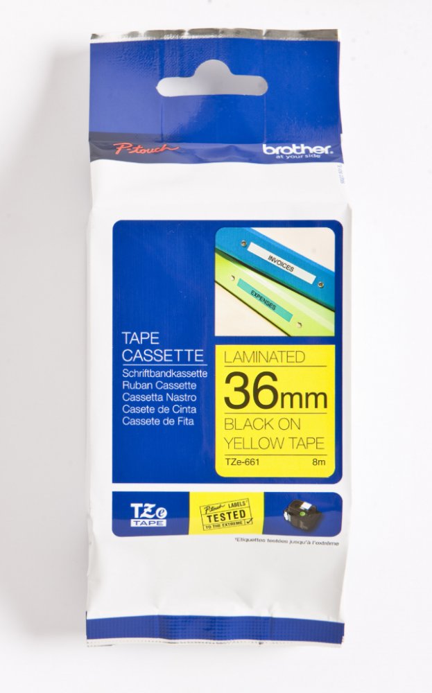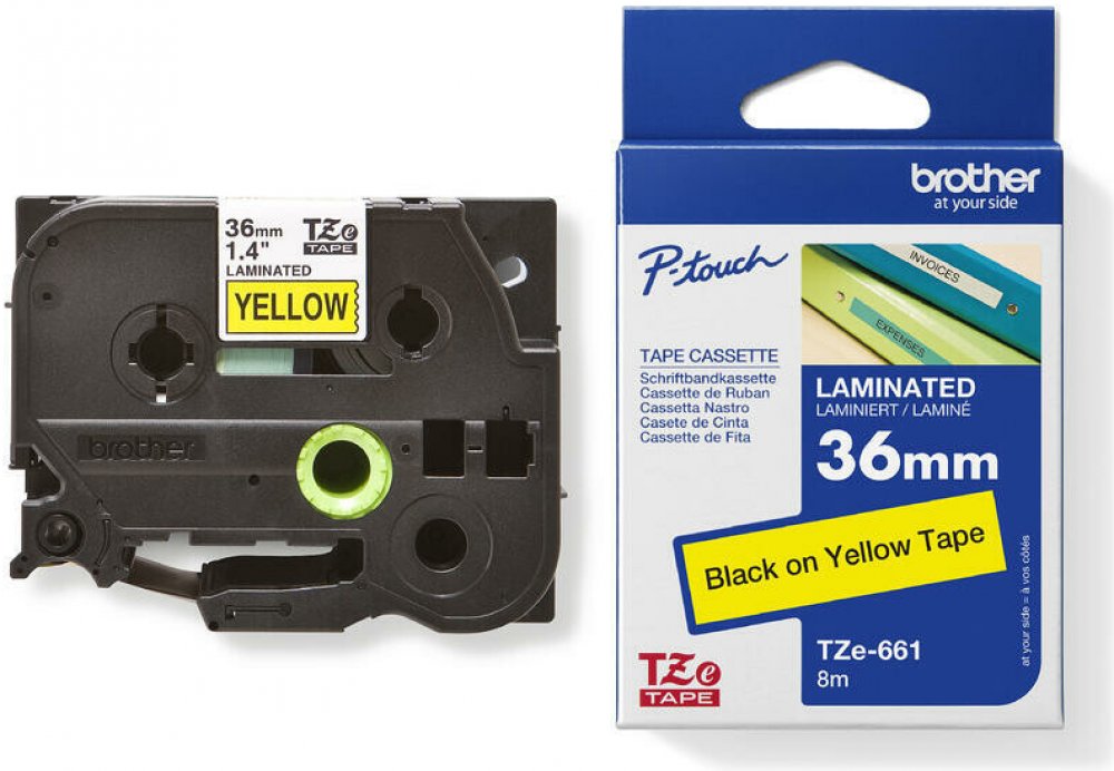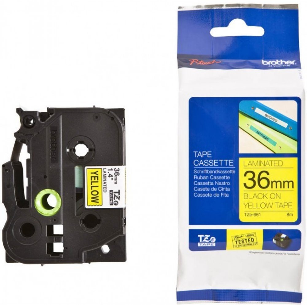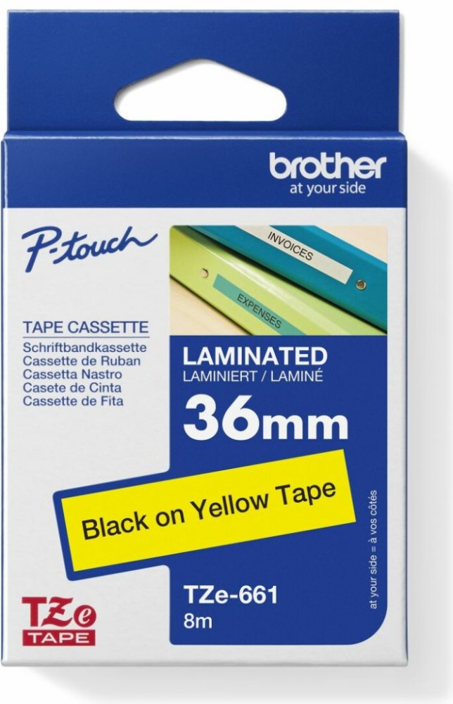 Originální kazeta s páskou TZe-661 je zárukou tvorby snadno čitelného štítku s ostrým textem. Kazeta TZe-661 s laminovanou páskou s černým tiskem na žlutém podkladu je stejně praktická v domácnosti, kanceláři či pracovišti. Může být použita k identifikaci obsahu šanonů, regálů až po USB flash disky, značení kabeláže a dalších zařízení. Samolepicí laminované štítky z této kazety byly vyvinuty s důrazem na odolnost proti extrémním teplotám, chemikáliím, oděru, slunečnímu záření a působení vody tak, aby byly vhodné pro vnitřní i venkovní použití. Páska je kompatibilní s tiskárnami štítků P-touch.