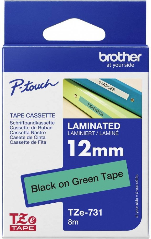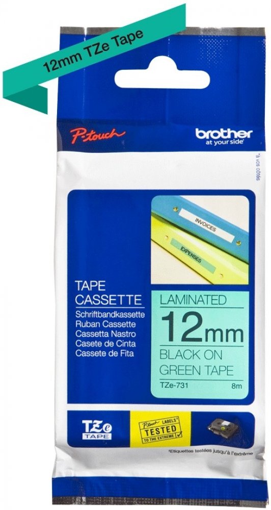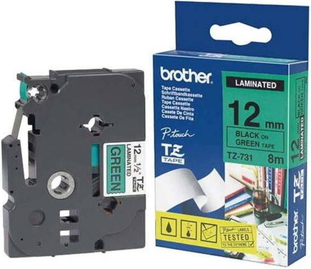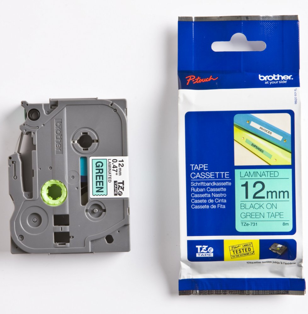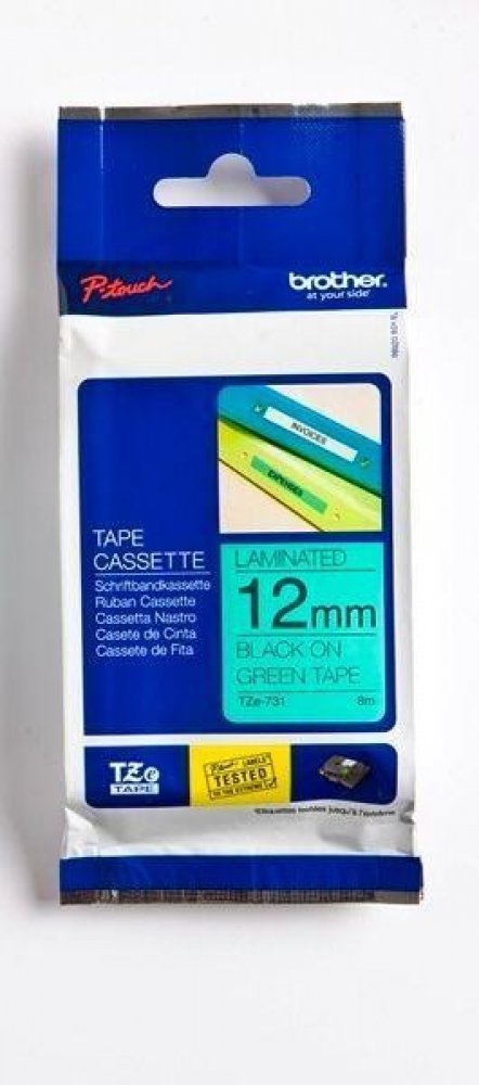 Originální kazeta s laminovanou páskou TZe-731 kompatibilní s širokou řadou tiskáren Brother P-touch je zvláště všestranná díky své snadno čitelné černé a zelené barvě - ideální pro domácnost, kancelář a další pracoviště.