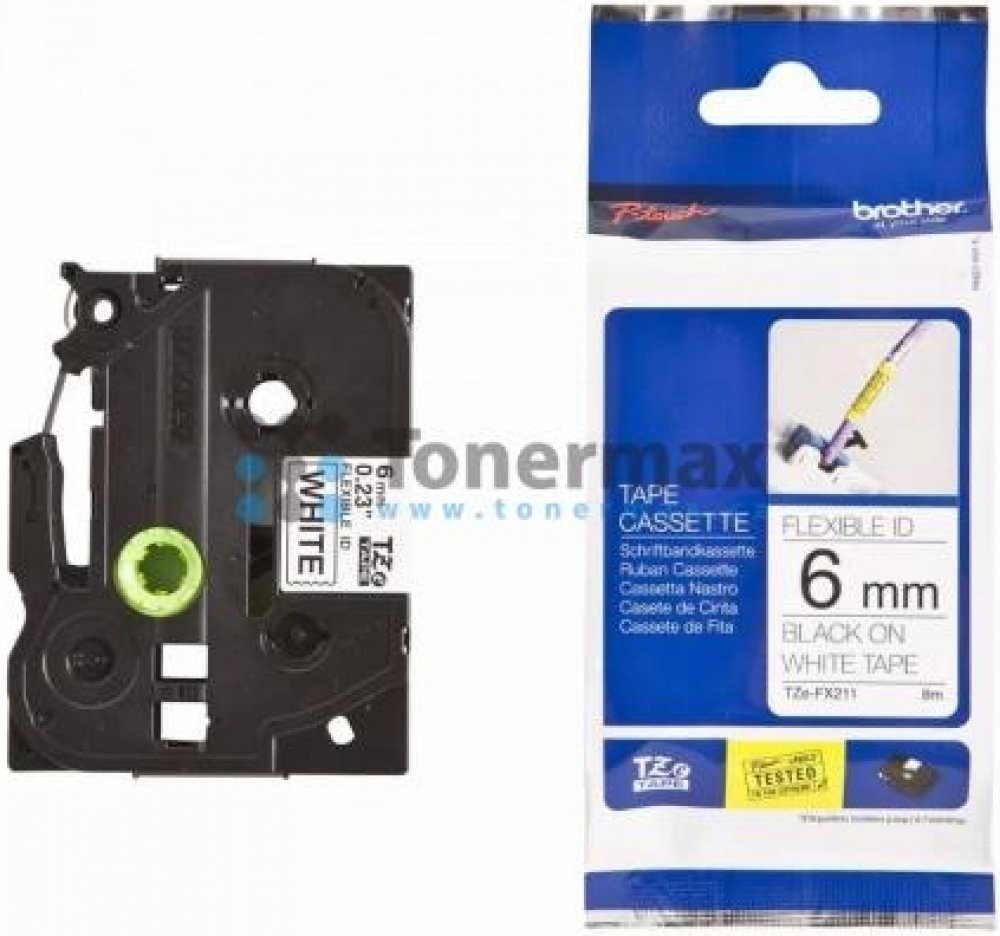 Originální páska Brother TZe-FX211, 6 mm, flexibilní bílá páska / černý tisk, výtěžnost 8 m. Pro tiskárny Brother P-touch 18R, PT-18R, P-touch 300, PT-300, P-touch 550, PT-550, P-touch 900, PT-900, P-touch 1000, PT-1000, P-touch 1010, PT-1010, P-touch 1080, PT-1080, P-touch 1090, PT-1090, P-touch 1230PC, PT-1230PC, P-touch 1260, PT-1260, P-touch 1280, PT-1280, P-touch 1830, PT-1830, P-touch 1950, PT-1950, P-touch 2030, PT-2030, P-touch 2100, PT-2100, P-touch 2420PC, PT-2420PC, P-touch 2430PC, PT-2430PC, P-touch 2450DX, PT-2450DX, P-touch 2460, PT-2460, P-touch 2470, PT-2470, P-touch 2480, PT-2480, P-touch 2500PC, PT-2500PC, P-touch 2700, PT-2700, P-touch 2730, PT-2730, P-touch 3600, PT-3600, P-touch 7100, PT-7100, P-touch 7500, PT-7500, P-touch 7600, PT-7600, P-touch 9200DX, PT-9200DX, P-touch 9200PC, PT-9200PC, P-touch 9400, PT-9400, P-touch 9500PC, PT-9500PC, P-touch 9600, PT-9600, P-touch 9700PC, PT-9700PC, P-touch 9800PCN, PT-9800PCN, P-touch D200, PT-D200, P-touch D200BW, PT-D200BW, P-touch D200VP, PT-D200VP, P-touch D210, PT-D210, P-touch D210VP, PT-D210VP, P-touch D400, PT-D400, P-touch D410, PT-D410, P-touch D410VP, PT-D410VP, P-touch D450, PT-D450, P-touch D450VP, PT-D450VP, P-touch D600, PT-D600, P-touch D600VP, PT-D600VP, P-touch D800W, PT-D800W, P-touch E100, PT-E100, P-touch E100VP, PT-E100VP, P-touch E110, PT-E110, P-touch E110VP, PT-E110VP, P-touch E300, PT-E300, P-touch E300VP, PT-E300VP, P-touch E550W, PT-E550W, P-touch E550WSP, PT-E550WSP, P-touch E550WVP, PT-E550WVP, P-touch E720BT, P-touch E920BT, P-touch GL200, PT-GL200, P-touch H75, PT-H75, P-touch H100, PT-H100, P-touch H105, PT-H105, P-touch H105WB, PT-H105WB, P-touch H107, PT-H107, P-touch H110, PT-H110, P-touch H300, PT-H300, P-touch H500, PT-H500, P-touch P700, PT-P700, P-touch P750TDI, PT-P750TDI, P-touch P750W, PT-P750W, P-touch P900W, PT-P900W, P-touch P900Wc, PT-P900Wc, P-touch P950NW, PT-P950NW, PT-P300BT, PT-P710BT, PT-P910BT