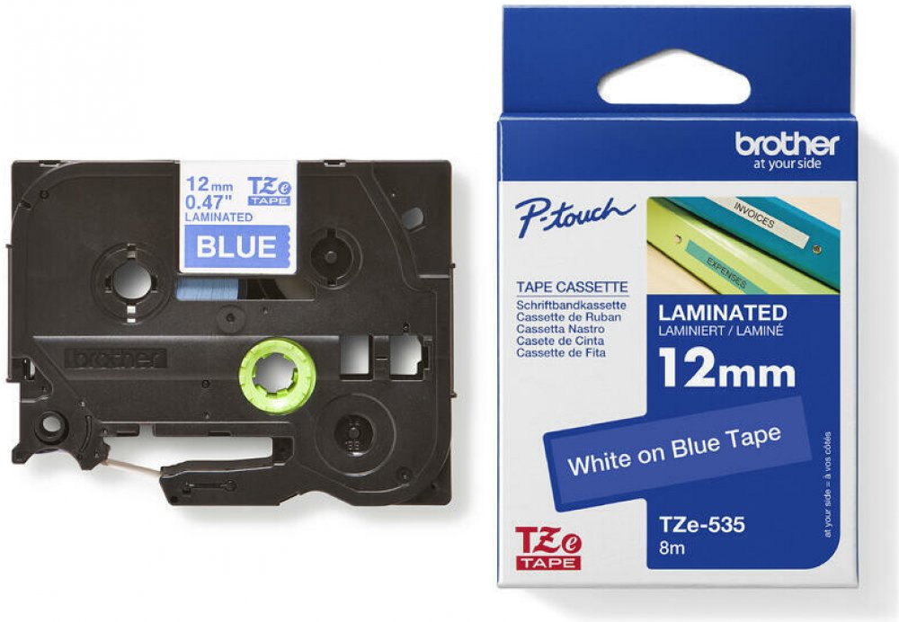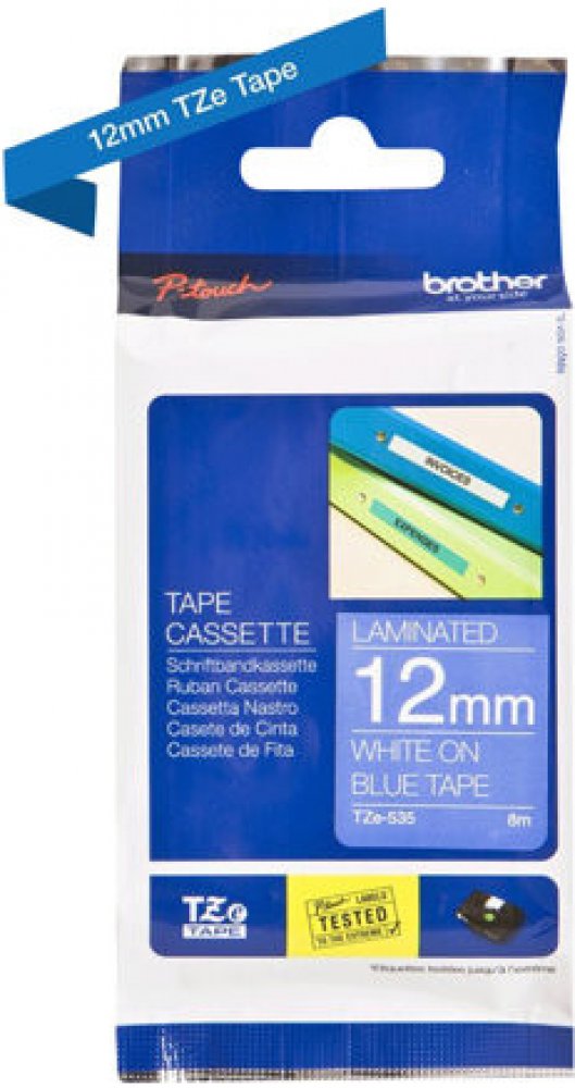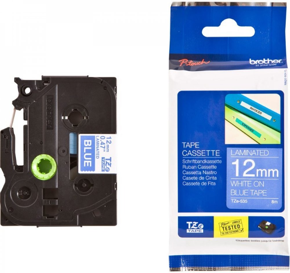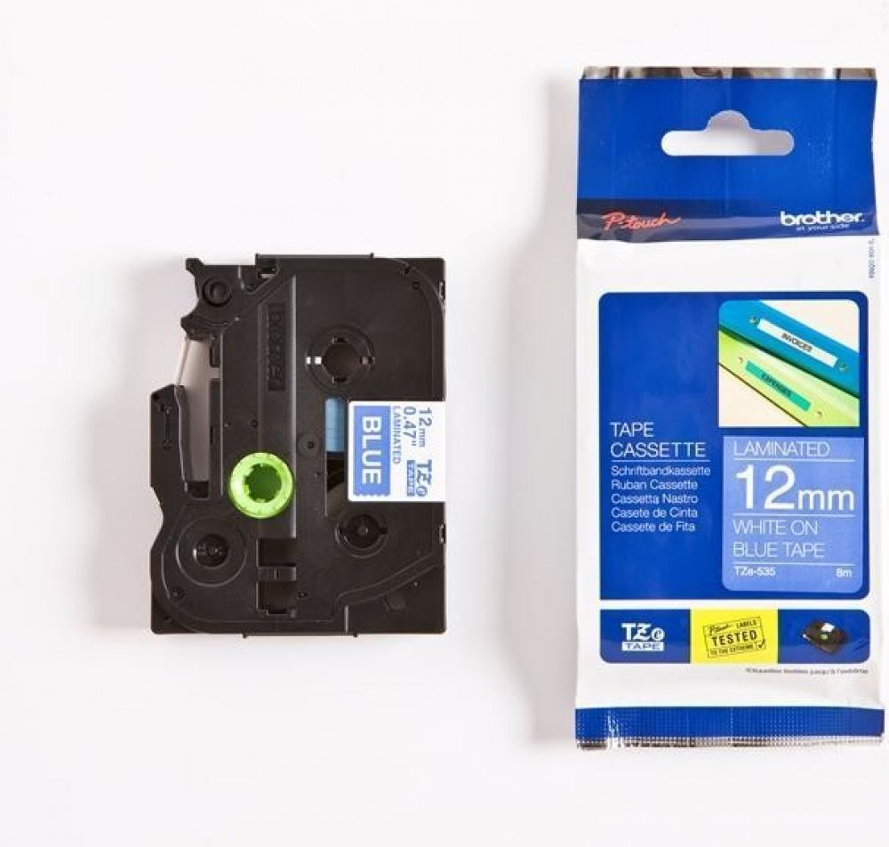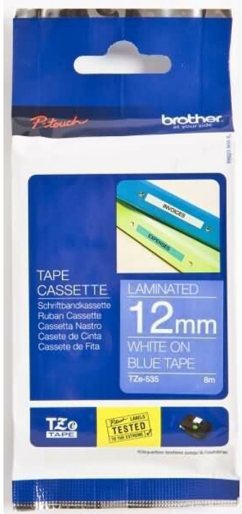 Originální kazeta s laminovanou páskou TZe-535 kompatibilní s širokou řadou tiskáren Brother P-touch je zvláště všestranná díky své snadno čitelné bílé a modré barvě - ideální pro domácnost, kancelář a další pracoviště.