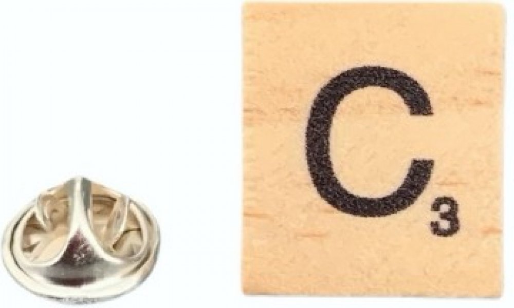 Design: Scrabble destička Písmeno: C3 Barva: Béžová - černá - stříbrná Materiál: Dřevo + slitina kovů Rozměry: 1.8 x 2 cm