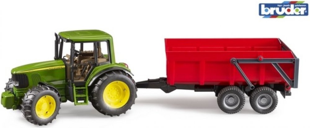 Traktor JOHN DEERE 6920 a sklápěcí valník ocení každý malý zemědělec. Jak jsme zvyklí má traktor Bruder 02057 výklopné víko motoru, profilované pneumatiky a je řiditelný pomocí prodlouženého volatu, který se vkládá otvorem ve střeše traktrou.
