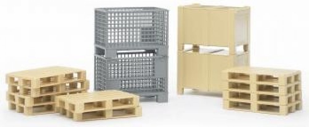 Bruder 2415 - Logistický set - Sada se skládá ze dvou rozvodných krabic, dvou krabic s víkem a z deseti europalet. Sada je ideálním doplňkem pro dopravu a logistiku vozidel, jako jsou kontejnerové vozíky řady Profi.