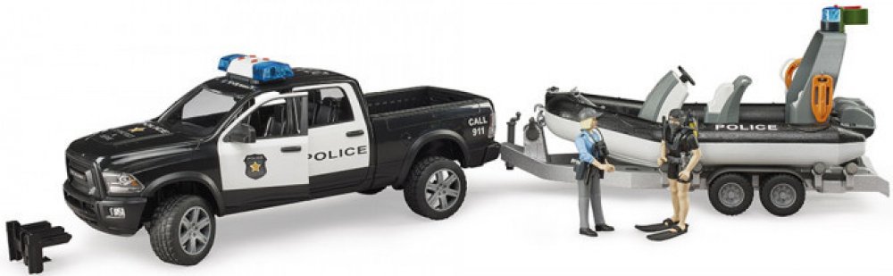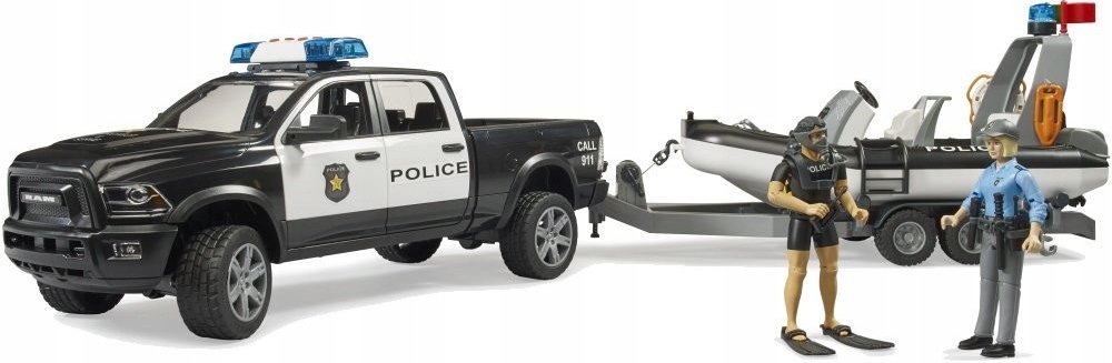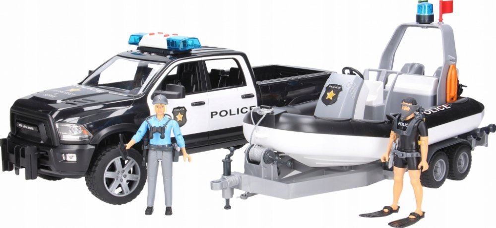 Balení obsahuje: policejní auto RAM, přívěs, člun s příslušenstvím a 2 figurky (1x policistka a 1x potápěč)