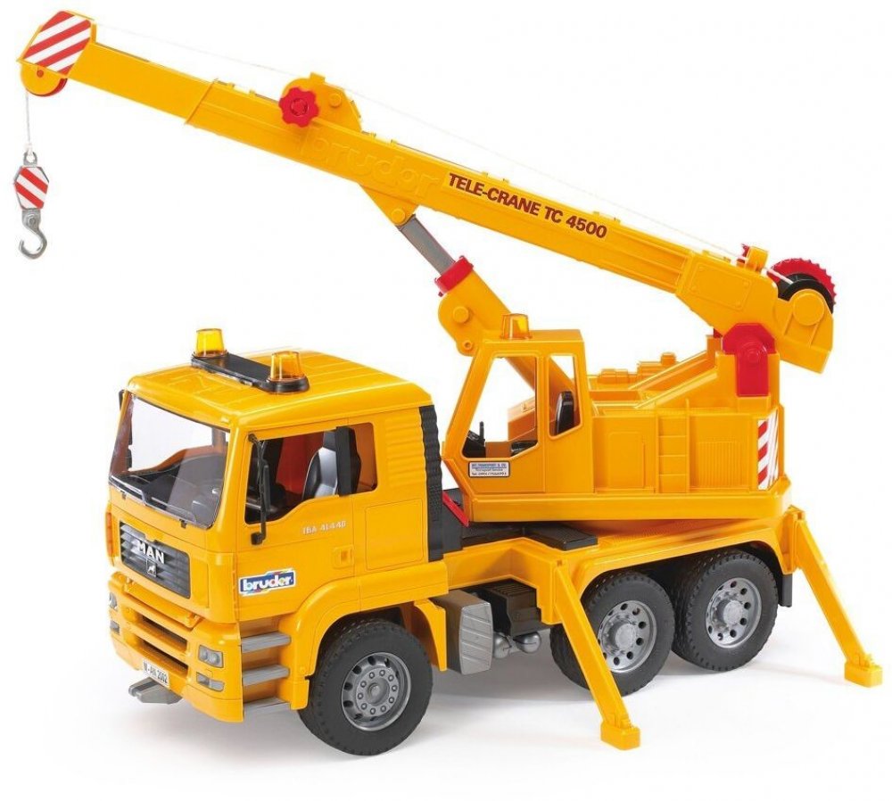 Sklápěcí kabina tohoto vozu umožňuje jednoduše nahlédnout do motoru. Venkovní zrcátka lze též snadno sklápět. Jeřábový nástavec je otočný až o 360 stupňů. Výsuvné rameno se může prodloužit a pohodlně ovládat otočným knoflíkem. Navíjecí lano je plně funkční, pro rychlé spouštění je k dispozici odblokovací tlačítko. Ideální je kombinace tohoto jeřábu s multifunkčním modulem se světlem a zvukem 02801, který lze jednoduše dokoupit, má čtyři různé funkce: houkačku, zvuk motoru, sirénu a blikající světlo, vaše děti budou zaručené nadšené. Jeřáb je vybaven boxem s nářadím a pevnými profilovými pneumatikami.