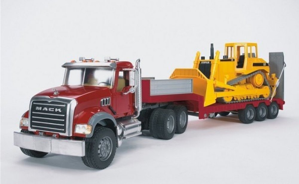 MACK Granite zaujme svou realistickou kabinou s otevíracími dveřmi, výklopnou kapotou motoru, sklápěcími zrcátky a chromovými doplňky, které dodávají vozu autentický vzhled. Návěs má sklopné nájezdové rampy, které usnadňují nakládku a vykládku strojů, a nastavitelné zajišťovací lišty pro bezpečné upevnění nákladu.