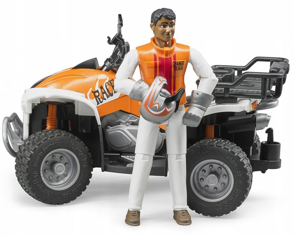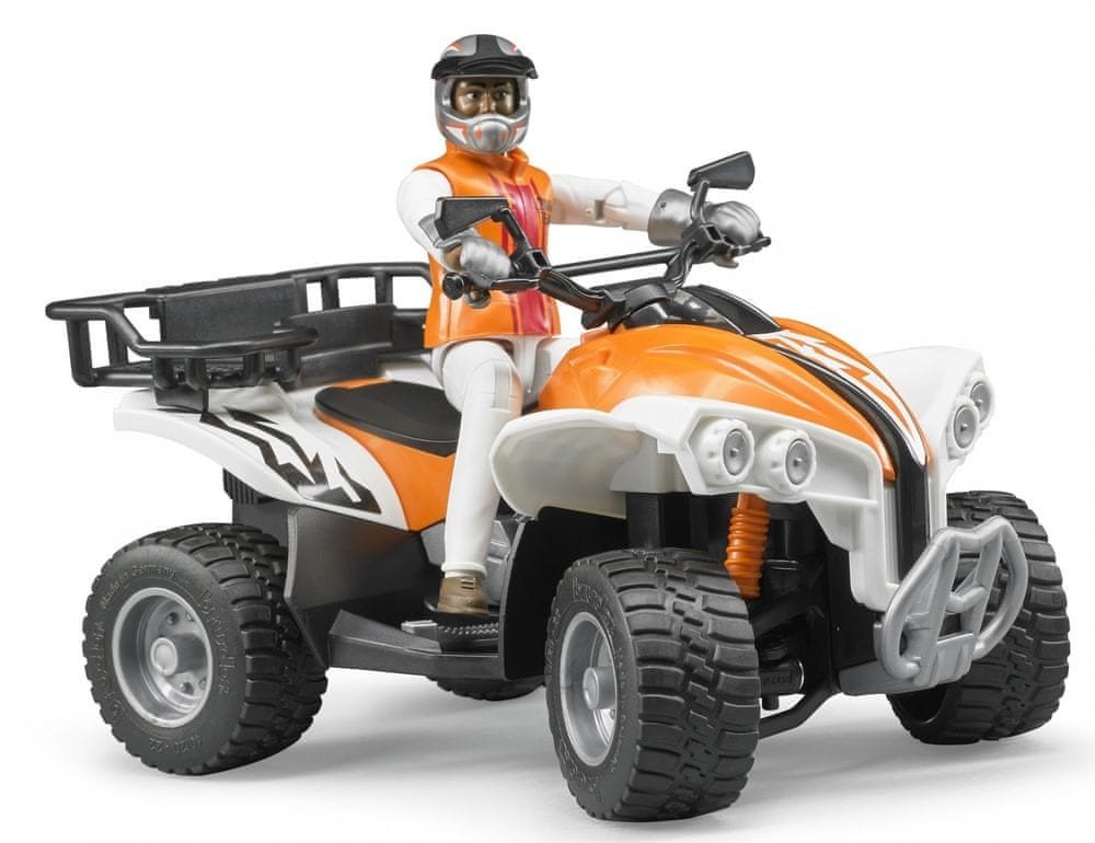 Čtyřkolka kombinuje zábavu na motocyklu s flexibilitou terénního vozidla. Není tedy divu, že čtyřkolky mají své oblasti použití jak v lesnictví a zemědělství, tak na staveništích nebo ve volném čase a jsou stále populárnější. Čtyřkolka od BRUDERu přesvědčuje svým vizuálně velmi moderním a vysoce kvalitním designem, díky kterému je trvalým dojmem jak v každodenním životě, tak na sportovních terénních tratích. Díky odpružení obou náprav a řiditelnosti přední nápravy je Quad velmi chytlavá a umožňuje přesné manévrování i v nejtěžším terénu. Díky odnímatelnému zavazadelníku, přívěsu a držákům nářadí je čtyřkolka také ideální pro použití jako užitková vozidla. Realistickou implementaci vozidla ve spojení s postavou bworldu lze stěží překonat, pokud jde o realismus. Mimo jiné je působivý také vzhled postavy, která pokračuje v tématu terénních závodů s helmou řidiče a moderní ochrannou vestou. Díky pevné přilnavosti na řídítkách a sedadlu řidiče optimalizovanému pro sportovní místo k sezení si řidič vždy zachovává kontrolu i při jízdě vysokou rychlostí v drsném terénu. Stabilní ochrana proti nárazu a přilnavé pneumatiky dotvářejí perfektní obraz. Rozměr balení 23 x 19 x 11 cm. Doporučený věk od 4 let.