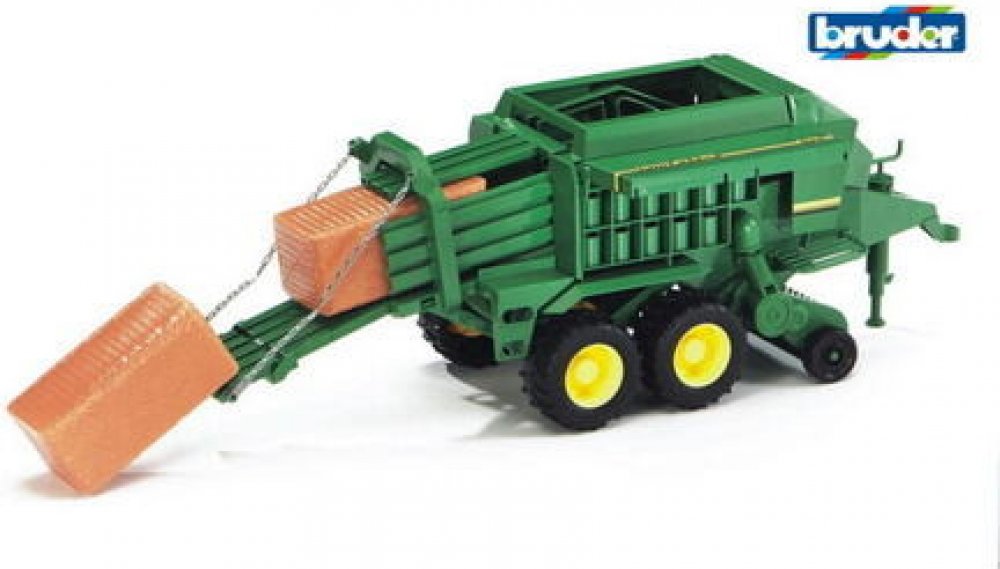 Lis na velké balíky má otevíratelné zásobníky a otevírat lze také servisní klapku s lisovacím mechanismem. Automatický dopravník přepraví dva balíky sena. Tento lis na velké balíky John Deere je vhodný pro všechny traktory Bruder.