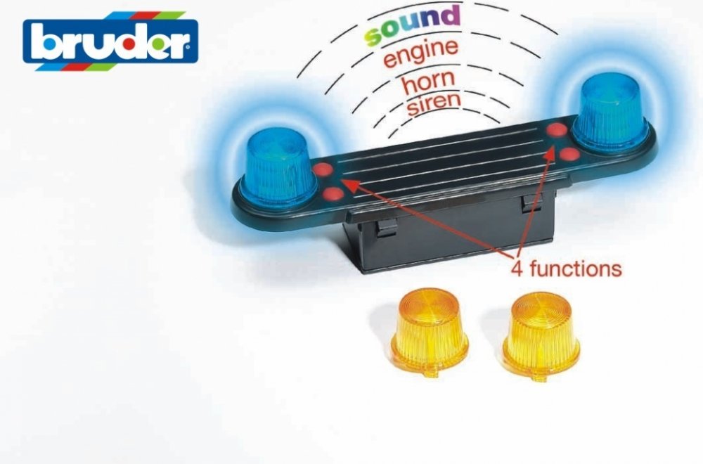 Maják a siréna lze spustit. 4 různé funkce: klakson, zvuk motoru, zvuk sirény. Maják možno změnit z americké verze na evropskou pomocí přepínače u baterií. Zvuk se vypne opětovným zmáčknutím tlačítka nebo sám, přibližně po 18 sec. Balení obsahuje baterie (AAA). Modul lze nainstalovat na všechny nákladní vozy MAN a MB Actors a také na MB Unimogs. Zhotoven z velmi kvalitního plastu.