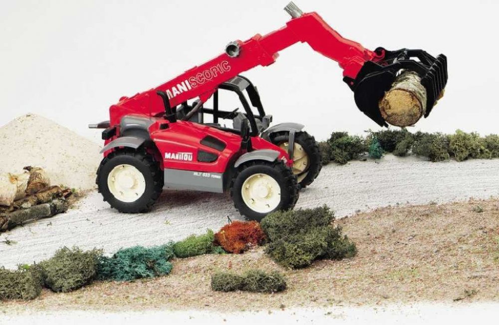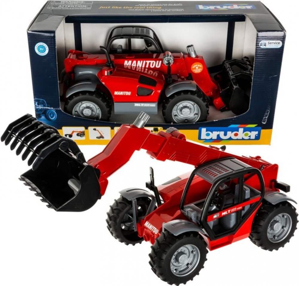 BRUDER 2125 - Manitou Teleskopický nakladač MLT 633 je velice pěkný model nakladače s otevíratelnou kapotou a možností manipulace s ramenem a čelistí. BRUDER Nakladač Manitou byl vyroben v měřítku 1:16 ke skutečnému nakladači jako věrná plastová kopie. Jde o velice kvalitní zpracování německé firmy BRUDER do nejmenších detailů, vyrobeno v Německu z vysoce kvalitního ABS plastu, pružného plastu s lesklým povrchem, precizně bez jakýchkoli otřepů či přetoků.