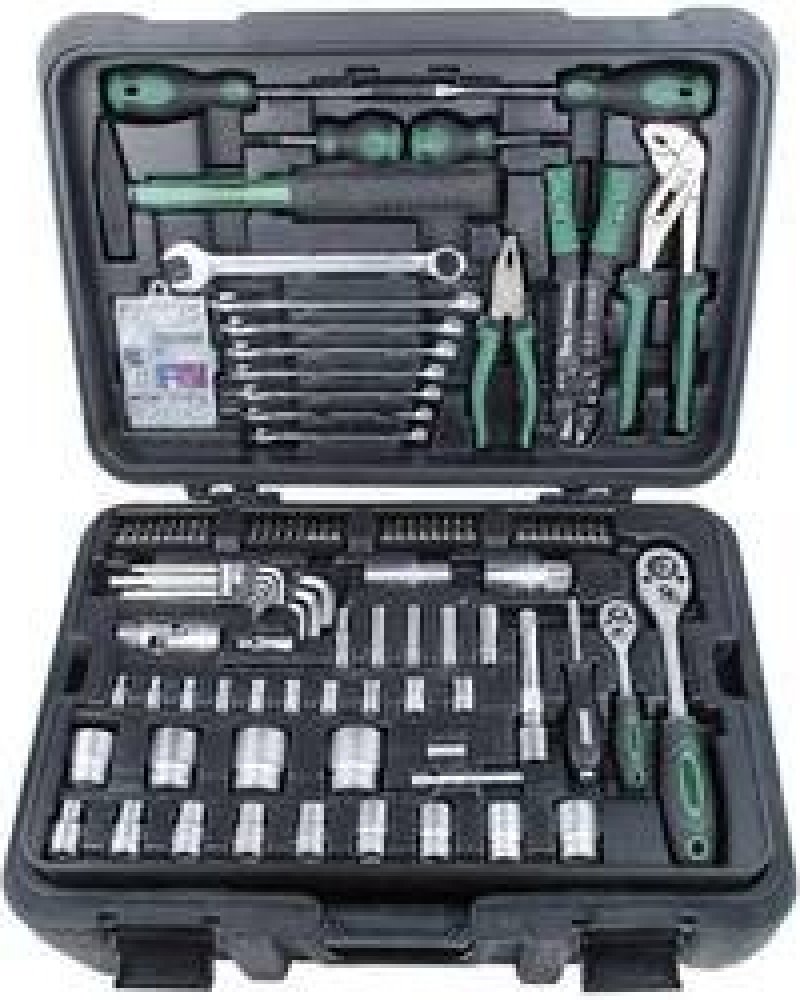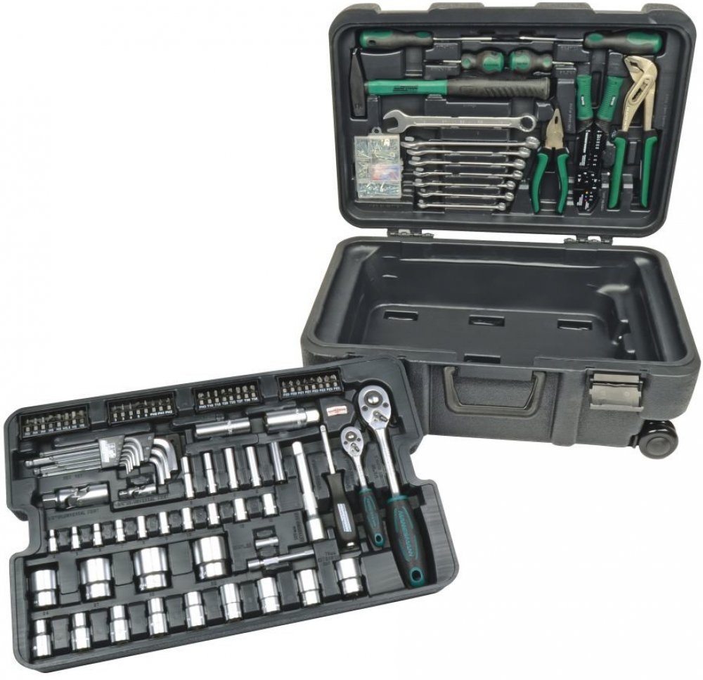 Pojízdný kufr s teleskopickou rukojetí. Místo pro další nářadí Prodloužení 12,5 mm (1/2") a 6,3 mm (1/4") · Přepínací ráčna 12,5 mm (1/2") a 6,3 mm (1/4") · Držák šroubováku s upnutím 6,3 mm (1/4") · 8 plochých klíčů s očkem 10/11/12/13/14/15/17/19 mm · Adaptér 6,3 mm (1/4") na vnitřní šestihran · 13 nástrčných klíčů 12,5 mm (1/2") 10/11/12/13/14/15/17/19/22/24/27/30/32 mm · 10 nástrčných klíčů 6,3 mm (1/4") 4/5/6/7/8/9/10/11/12/13 mm · 5 nástrčných klíčů 6,3 mm (1/4") dlouhé 6/7/8/9/10 mm · Cardanův kloub 12,5 mm (1/2") a vstupní upnutí 6,3 mm (1/4") · Karburátorový šroubovák plochý a křížový · 2 nástavce na zapalovací svíčky 12,5 mm (1/2") 16/21 mm · 32 šroubovacích bitů délka 25 mm ve 4 řadách bitů · Šroubovák plochý a křížový · Zámečnické kladivo 300 g, sklolaminát, přezkoušeno GS · Skřipcové kleště na kabelové botky · 25 kabelových botek · Kombinované kleště 178 mm (7") · SIKA kleště 240 mm, přezkoušeno GS · 9 klíčů s vnitřním šestihranem 1,5/2/2,5/3/4/5/6/8/10 mm · Upevňovací sortiment.