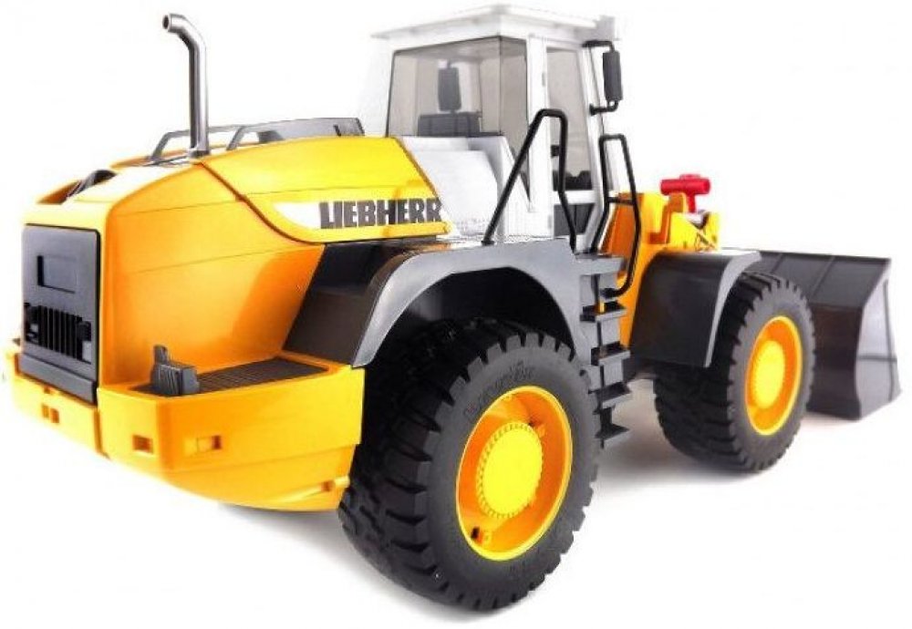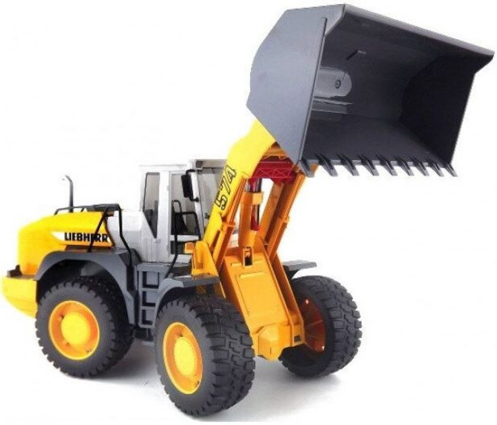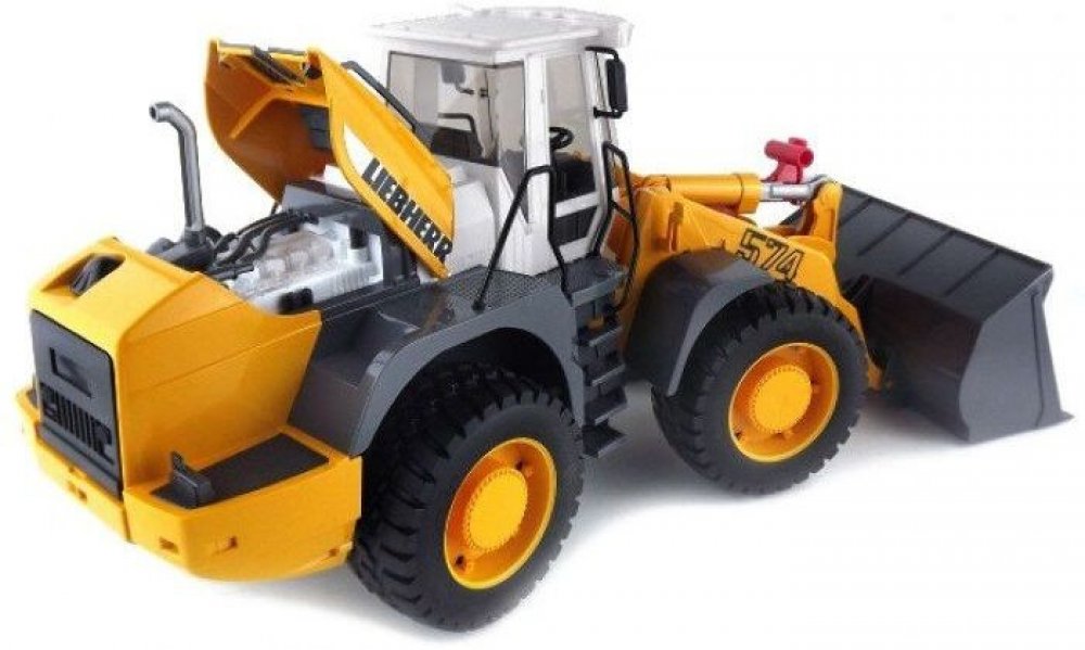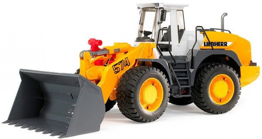 BRUDER 2430 Kolový nakladač Liebherr L574 je perfektně zpracovaný model, který má velkou sklopnou nakládací lopatu, kterou lze ovládat jednou rukou díky nově vyvinutému mechanismu lopaty. Přední náprava se společně s nakladačem otáčejí na obě strany, předním nakladačem se pohybuje pomocí jedné z páček, druhá páčka nakladač vysype. Zadní kola mají nezávislé zavěšení, kapota je odklopitelná s pohledem na blok motoru, zasklená kabina s průhledným hladkým plastem, profilované pneumatiky.