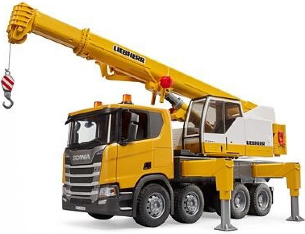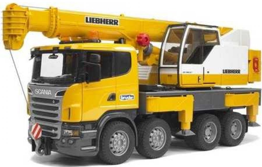 BRUDER 03571 Scania 560R autojeřáb Liebherr s teleskopickým ramenem. Detailní model, kvalitní a odolný plast, funkční části, vyrobeno v Německu. Hračka na baterie, se světlem a zvukem.