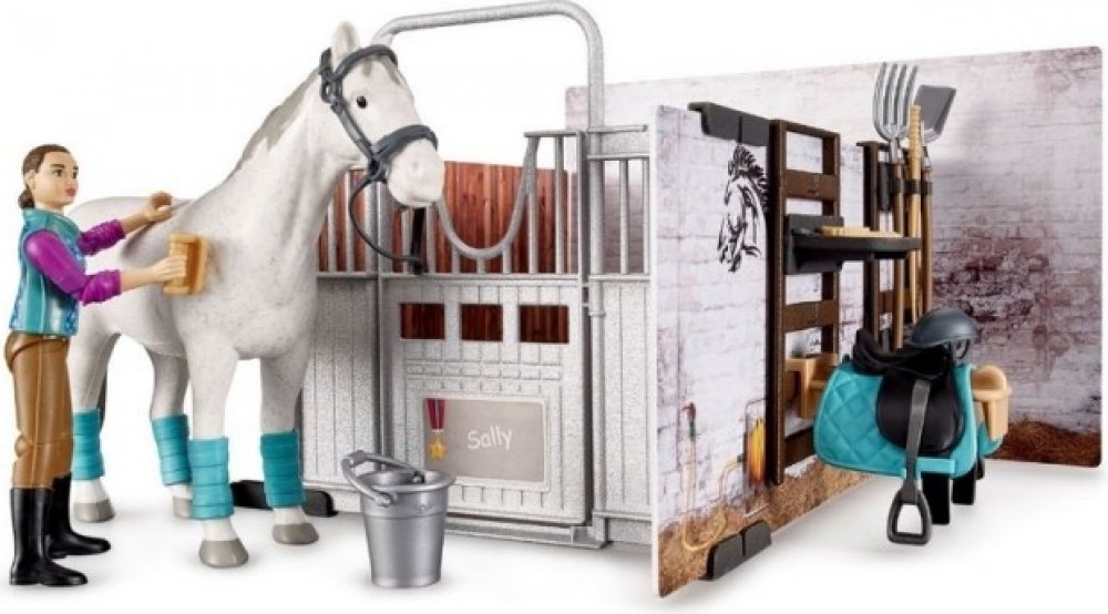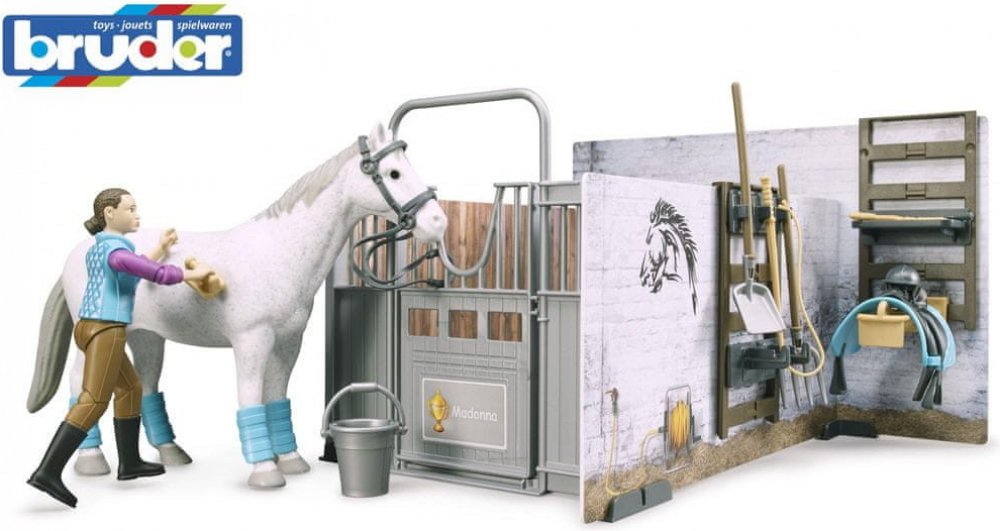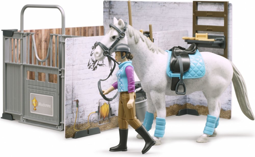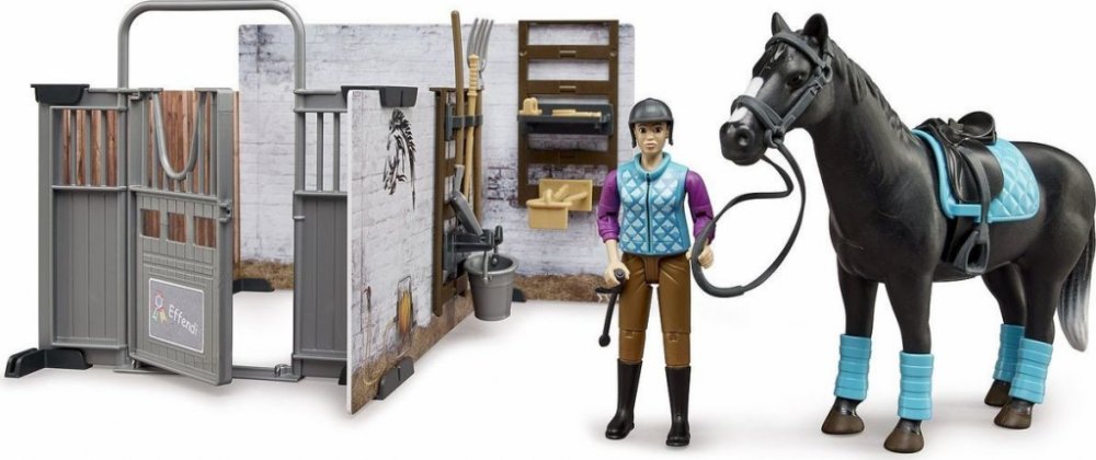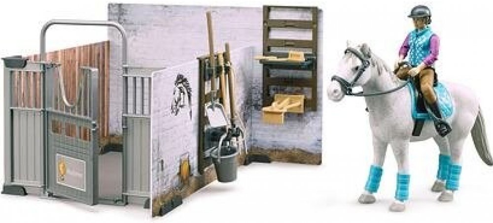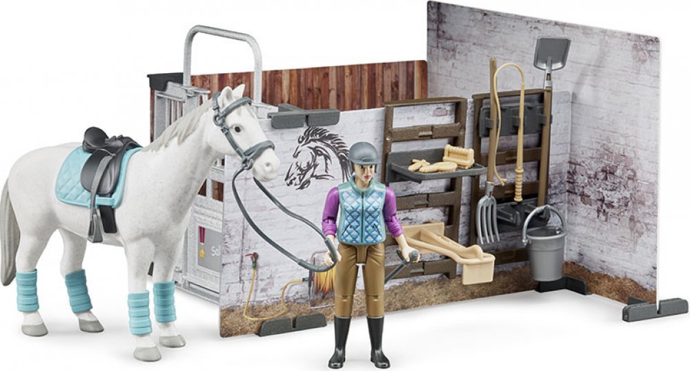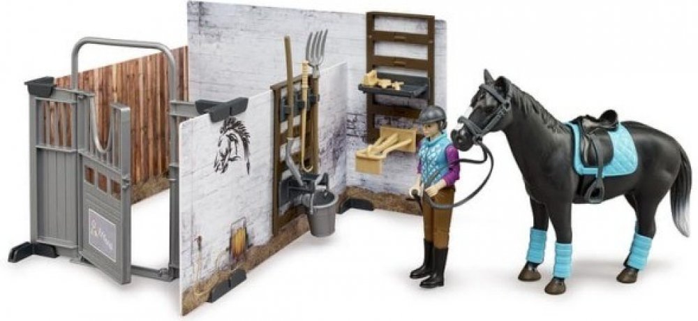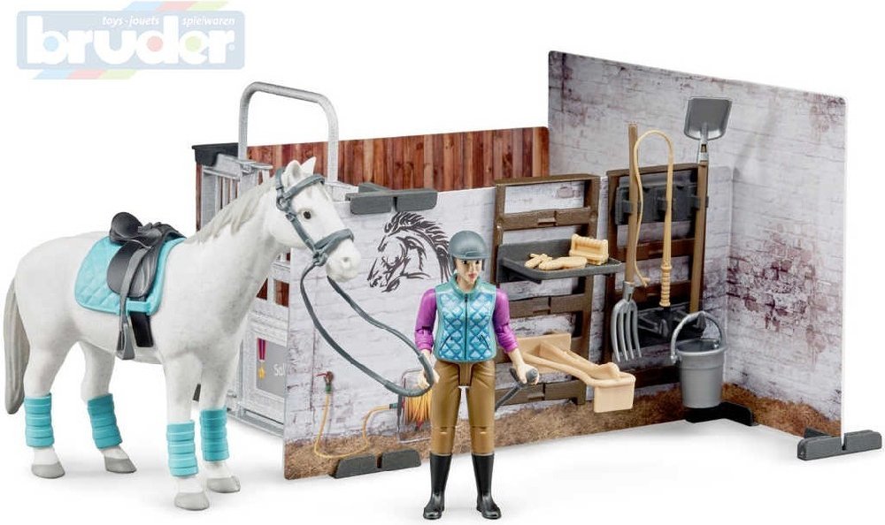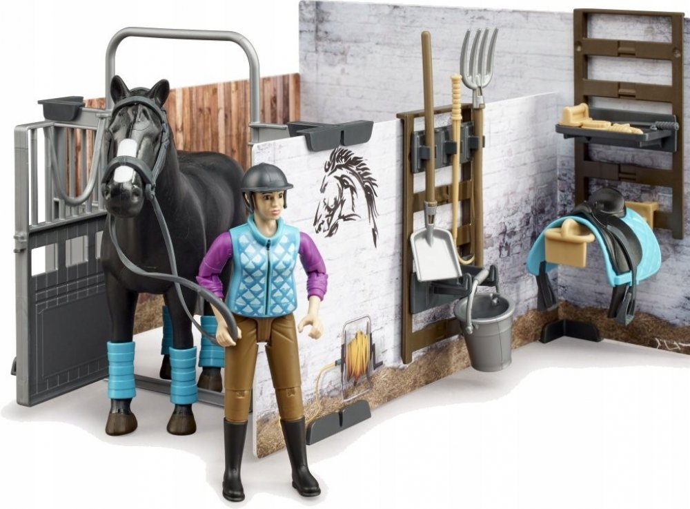 BRUDER 62506 - Stáj pro koně s jezdkyní, figurkou koně a příslušenstvím.