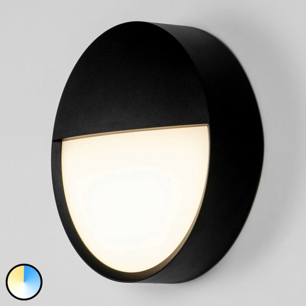 Venkovní nástěnné svítidlo LED Eye odolné proti povětrnostním vlivům má kulatý černý hliníkový rám, který zakrývá horní polovinu bílého plastového difuzoru - obsahuje ovládací zařízení - krytí IP65 - teplotu barvy lze zvolit ve třech stupních před instalací: 3 000 K, 4 000 K, 5 700 K