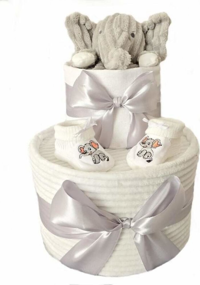 Dvoupatrový plenkový dort pro novorozené miminko Šedobílý sloník