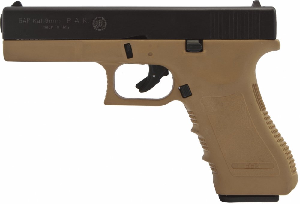 Plynová pistole Bruni GAP cal.9mm kat. PO desert bicolorModel GAP italského výrobce Bruni je replikou celosvětově známé pistole GLOCK. Její hranaté tvary uchvátily milióny uživatelů.Konstrukce pistole je stejně jakou u palné předlohy kombinací kovu a odolného pomyleru. Kovový závěr a hlaveň doplňuje polymerový spodí rám s rukojetí. Kombinováním materiálů se výrobci snaží docílit nižší celkové hmot...