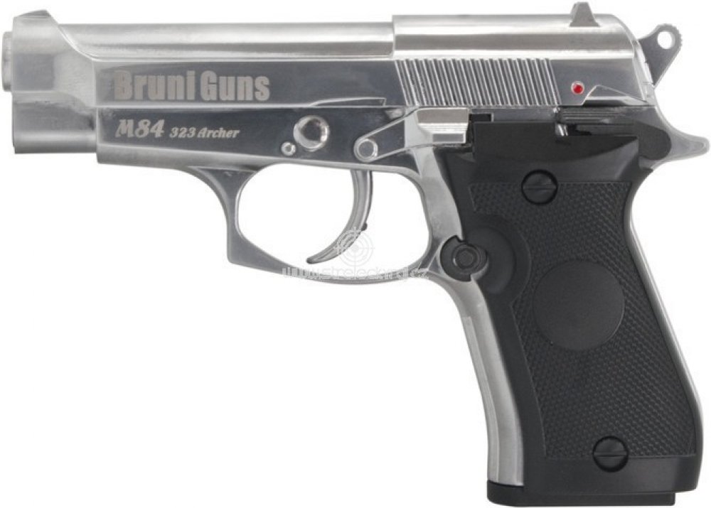 Bruni M84 323 Archer ráže 4,5 mm z nabídky italské společnosti BruniGuns je CO2 replikou modelové řady pistolí Cheetah, kterou italská společnost Beretta produkovala v různých provedeních a rážích v letech 1976 až 2017. Pistole má celokovovou konstrukci, kterou doplňují plastové střenky. Hladká hlaveň je určena pro střelbu BB ocelovými broky a není určena pro přesnou střelbu na terč, ale je vhodná pro zábavnou destruktivní střelbu, například na plechovky apod. Spoušťový mechanismus pracuje v režimu DA - Double Action, což znamená, že při stisknutí spouště se zbraň natáhne a při domáčknutí spouště dojde k výstřelu. Vnitřní mechanismus pohání jedna 12gramová CO2 bombička, která se po sejmutí střenky na levé straně vkládá do rámu rukojeti. Zásobník s kapacitou 15 BB ocelových broků ráže 4,5 mm se zasouvá do rukojeti. Na horní části nepohyblivého závěru jsou usazena pevná mechanická mířidla. Ve výbavě pistole nechybí pojistka proti náhodnému výstřelu, jejíž ovládání je umístěno na levé straně nad rukojetí. Parametry: Ráže: 4,5 mm Střelivo: BB ocelové broky Kapacita zásobníku: 15 ran Pohon: 1x CO2 bombička 12 gramů Energie udávaná výrobcem: do 3,0 J Úsťová rychlost: 105 m/s Délka hlavně: 90 mm Celková délka: 163 mm Hmotnost: 745 gramů Bezpečnostní pojistka: ano Obsah balení: Vzduchová pistole Bruni M84 323 Archer chrom ráže 4,5 mm Zásobník Bruni M84 323 Archer ráže 4,5 mm Návod se záručním listem Plastový kufřík
