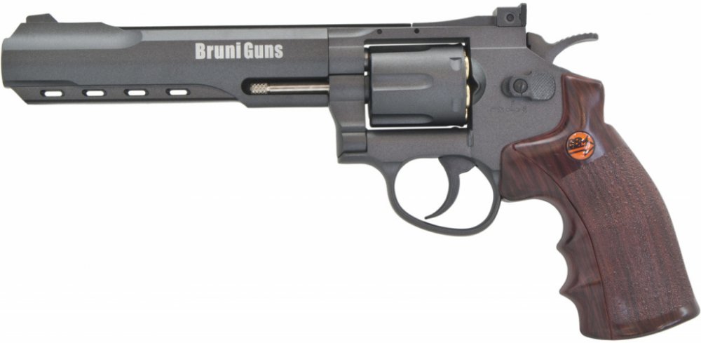 Bruni Super Sport 702 černý. Kvalitní celokovový revolver s realistickým nabíjením v černém provedení a s hladkou 6" hlavní. Ocelové broky v ráži 4,5 mm vložíte do replik nábojnic, které se následně umístí do komor bubínku. Celý mechanismus je…