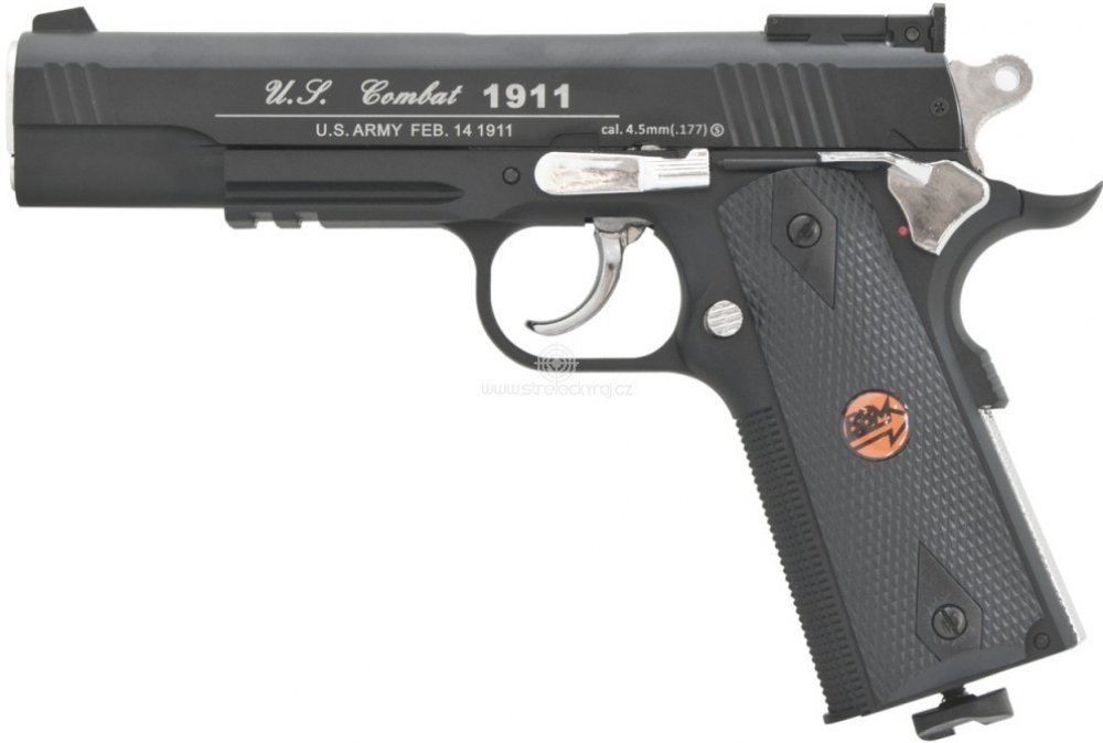 Bruni US Combat 1911 P černá. Italská firma Bruni představuje repliku legendárního Coltu 1911, která je určena na ocelové BB broky ráže 4,5 mm. Je ideální na rekreační a destrukční střelbu. Konstrukce pistole je tvořena kombinací kovu a polymeru