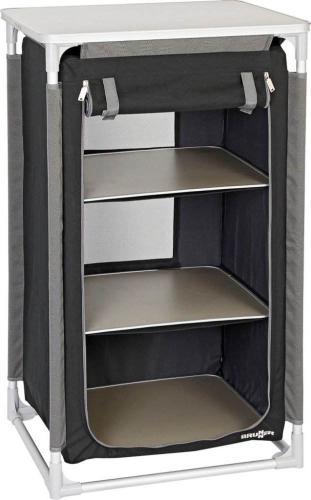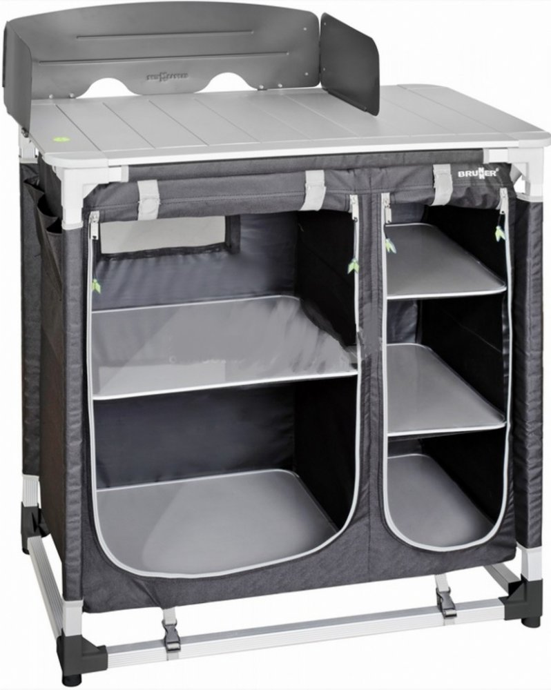 Kempingová kuchyňka Brunner Azabache s pracovní plochou o výšce 90 cm a integrovaným odnímatelným skládacím dřezem. Součástí jsou 3 police vpravo a 2 vlevo a také ochrana proti větru a stříkající vodě. Vlastnosti: Rám kabiny v antracitové barvě tvoří předinstalovaný rám tyče z hliníku, který je opatřený vysoce kvalitním potahem z odolného polyesteru. Kanály z tyčí jsou odolné proti opotřebení z ripstop-polyesteru potahu, v jehož zadní části je integrován větrací průzor. Umožňují rychlou montáž a demontáž, odkládací police se jednoduše umístí dovnitř konstrukce. Všechny nožičky otočného stolu jsou výškově nastavitelné a zajišťují bezpečné stání i na nerovném terénu. Horní uzávěr stabilní konstrukce tvoří pracovní deska. Součástí dodávky je praktická přepravní a úložná taška. Parametry: šířka: 110 cm výška: 90 cm hloubka: 48 cm hmotnost: 10 kg maximální zatížení: 30 kg velikost balení: 120 x 49 x 15 cm