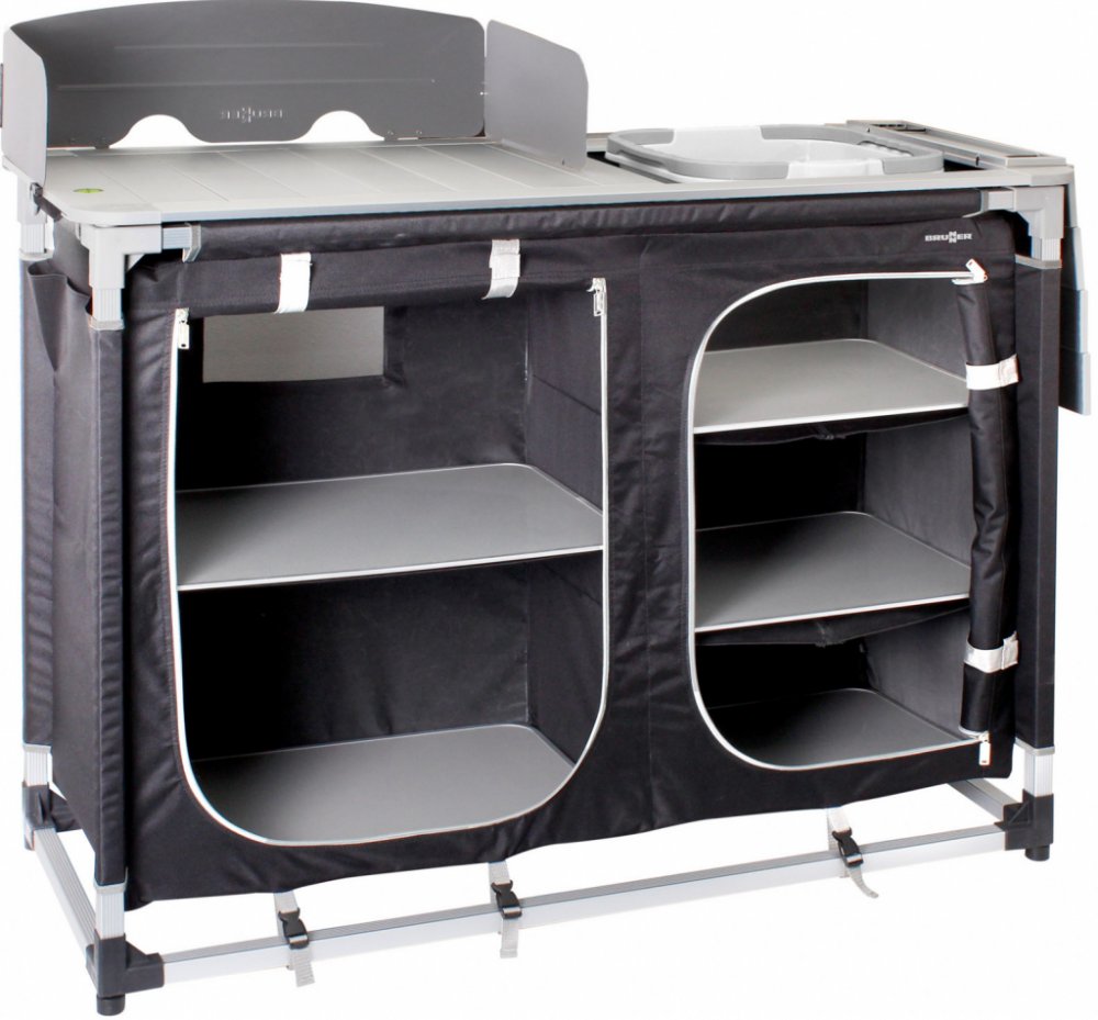Víceúčelová skříňka s velkými úložnými prostory a pojízdnou hliníkovou deskou. Kempingová kuchyňka Brunner Azabache s pracovní plochou o výšce 90 cm a integrovaným odnímatelným skládacím dřezem. Součástí jsou 3 police vpravo a 2 vlevo a také ochrana proti větru a stříkající vodě. Vlastnosti: Rám kabiny v antracitové barvě tvoří předinstalovaný rám tyče z hliníku, který je opatřený vysoce kvalitním potahem z odolného polyesteru. Kanály z tyčí jsou odolné proti opotřebení z ripstop-polyesteru potahu, v jehož zadní části je integrován větrací průzor. Umožňují rychlou montáž a demontáž, odkládací police se jednoduše umístí dovnitř konstrukce. Všechny nožičky otočného stolu jsou výškově nastavitelné a zajišťují bezpečné stání i na nerovném terénu. Horní uzávěr stabilní konstrukce tvoří pracovní deska. Součástí dodávky je praktická přepravní a úložná taška. Parametry: šířka: 110 cm výška: 90 cm hloubka: 48 cm hmotnost: 10 kg maximální zatížení: 30 kg velikost balení: 120 x 49 x 15 cm