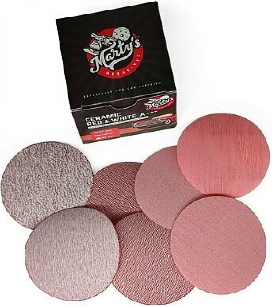 Brusné kotoučky Marty's Ceramic Red&White A+++ o zrnitosti P400 Brusivo Marty's Ceramic Red&White na kotoučích o průměru 75mm a zrnitosti P400 kombinuje keramické zrno se zrny z oxidu hlinitého , společně umístěné na podložce z folie. Použitím podkladové folie místo standardního papíru je u brusných kotoučků Ceramic Red&White docíleno vysoké odolnosti podložky proti roztržení. To dává kotoučům velmi dlouhou životnost, která dovoluje uživateli dobrousit jednotlivé brusné kotouče až do úplného konce. Keramické zrno v kombinaci Alox zrnem zaručuje maximální výkon a odolnost a to po celou dobu broušení. Brusný kotouč pro broušení za sucha o průměru 75 mm se střední zrnitostí P400 je ideální pro použití na malé plochy a detaily, skvěle se uplatní například i při opravě a renovaci světlometů . Může být také použit k broušení oceli, nerezu, hliníku nebo plastů. Samotné brusné kotoučky Marty's Ceramic Red&White o průměru 75mm si můžete objednat v široké škále zrnitostí , od velmi hrubých P80 až po velmi jemné P2000. Ukázku některých ze zrnitostí vám nabízí následující obrázky. K upevnění do brousícího nástroje doporučujeme využít například podložný talíř MaxShine , který je stejně jako brusivo Marty's Ceramic Red&White již z výroby opatřen velmi kvalitním suchým zipem. Upozornění: uvedená cena zboží je za jeden kus brusného kotoučku, nikoliv za celé balení.