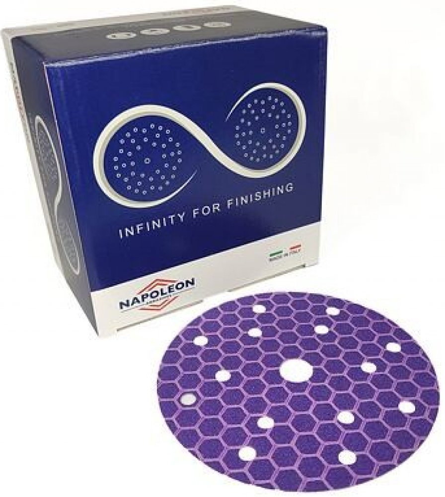 Brusné kotoučky Napoleon Hexagon o zrnitosti P400 Brusivo Napoleon Hexagon se skládá z velurové podložky o průměru 150 mm a keramického zrna o zrnitosti P400. Samotná brusná zrna jsou na podkladu tvarována do pravidelných šestiúhelníků s volnými kanálky mezi nimi. Tento způsob umístění zrna několikanásobně snižuje ucpávání a zanášení povrchu brusiva. Volnými kanálky může bez problémů proudit vznikající prach a plocha brusiva se dále výrazně více chladí. Během procesu broušení se jednotlivá keramická zrníčka lámou a neustále tak vznikají nové ostré hrany, což zaručuje nejvyšší brusný výkon až do úplného opotřebení. Velurová podložka se, na rozdíl od papírové, netrhá a zachovává si své vlastnosti také až do úplného opotřebení brusného zrna. Na její zadní straně je suchý zip pro připevnění k vhodnému podložnému talíři. Samotné brusné kotoučky Napoleon Hexagon o průměru 150mm si můžete objednat v široké škále zrnitostí , od velmi hrubých P80 až po jemné P400. Upozornění: uvedená cena zboží je za jeden kus brusného kotoučku, nikoliv za celé balení.