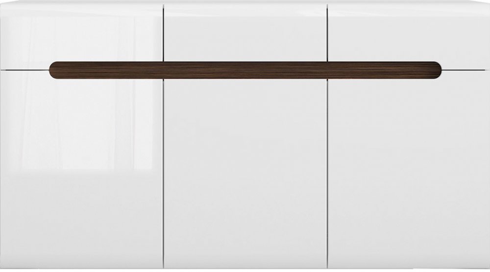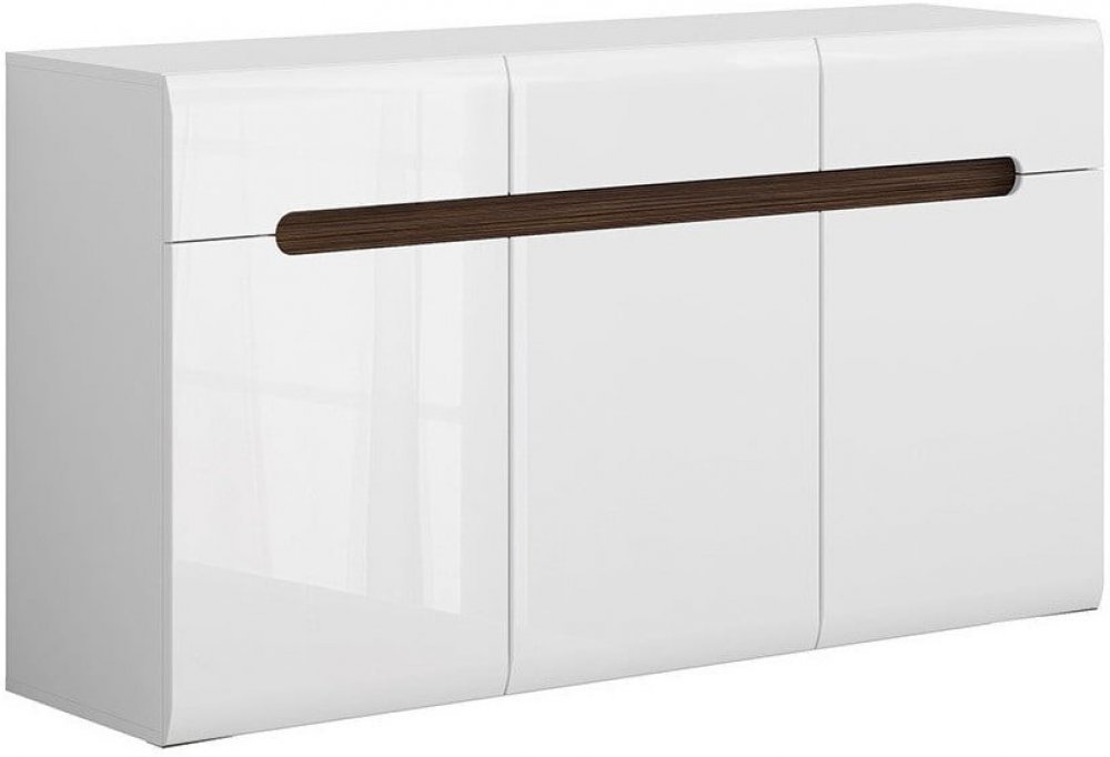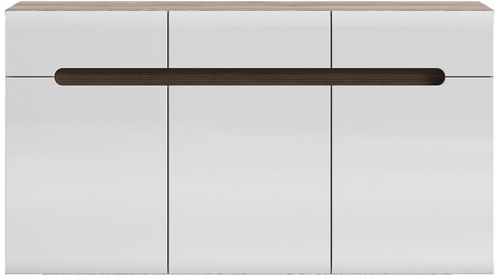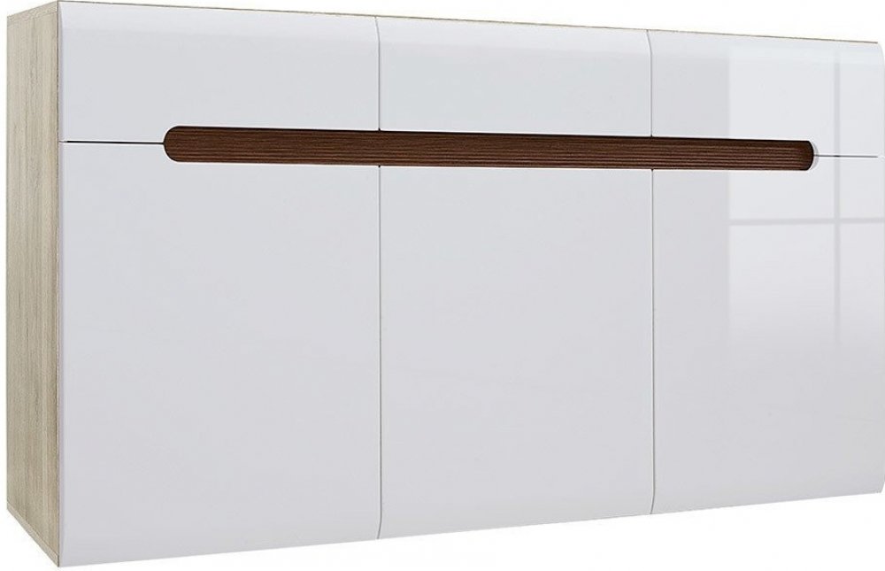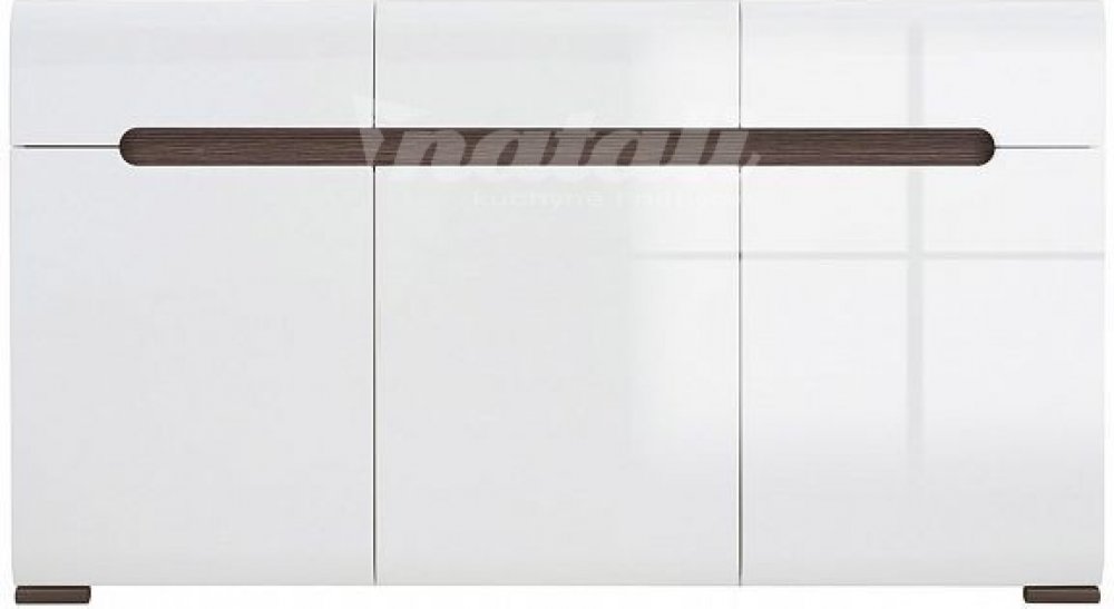 Skříňka z kolekce AZTECA TRIO v barevném provedení korpus bílý/čela zásuvek bílý vysoký lesk/úchyt dub wenge magický/bílý lesk/černý lesk. Skříňka se dělí na 3 části dělícími stěnami. Každá část se skládá z 1 zásuvky a skříňky s 1 policí. Materiálem korpusu je dřevotříska s fólii finish, hrany jsou melaminové, čela zásuvek z MDF desky s PVC fólii. Panty a pojezdy FGV s plynulým a tichým dovíráním. Minimalistický a elegantní - to je nábytek ze systému AZTECA TRIO. 13 prvků ve dvou barevných provedeních: bílá/bílý vysoký lesk s úchytem dub wenge magie/bílý lesk/černý lesk a dub san Remo/dub San Remo s úchytem v barvě dub wenge magie/bílý lesk/černý lesk. Díky těmto kombinacím snadno vytvoříte jedinečný interiér s minimalistickým designem. Za pozornost stojí úchytky v originálním tvaru a zaoblené hrany dvířek.