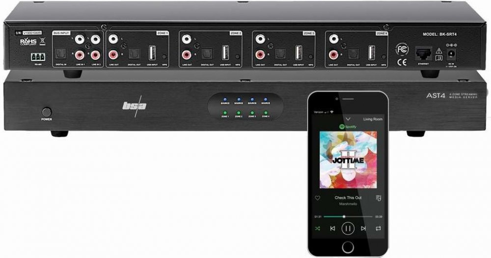 AST4 BS ACOUSTIC Síťový přehrávač AST4 AST4 je 4-zónový síťový přehrávač (streamer) umožňující přehrávat internetová rádia, podcasty a hudební soubory z lokálního nebo síťového (NAS) úložiště do stávající audio sestavy. Každá zóna obsahuje také samostatný USB/MP3 přehrávač, má stereo linkový výstup (2x RCA) a digitální optický výstup (Toslink). Zařízení obsahuje také 1x stereo AUX vstup (2x RCA), ...