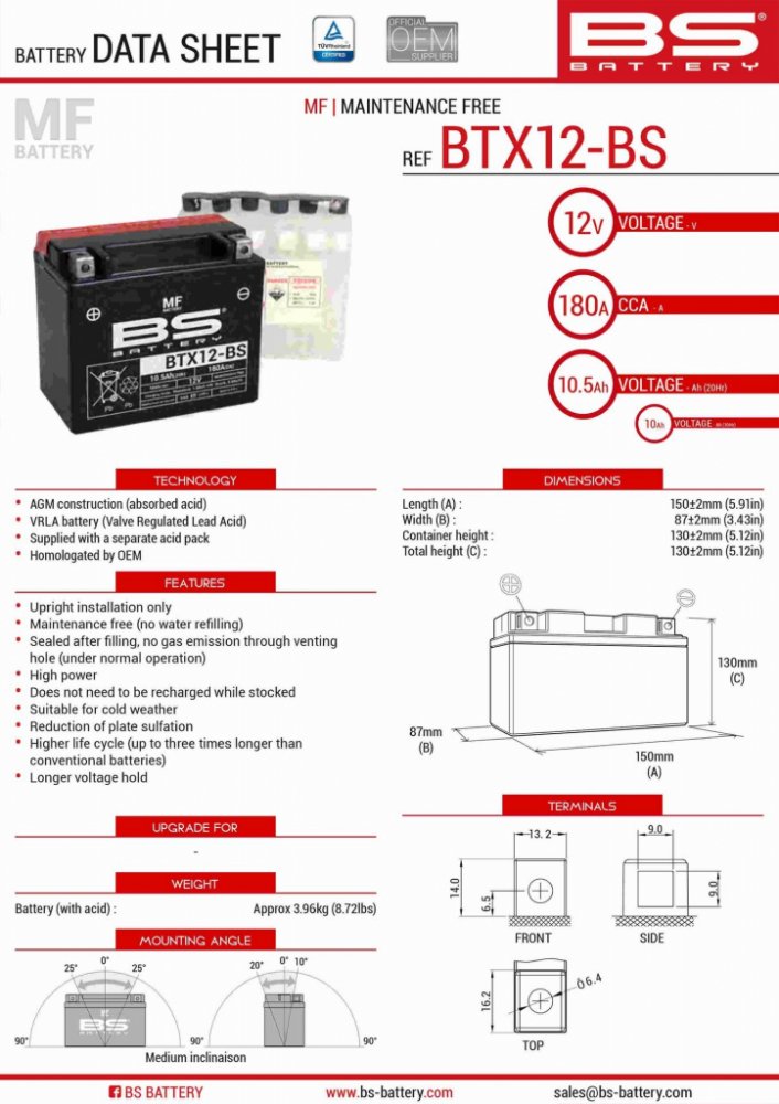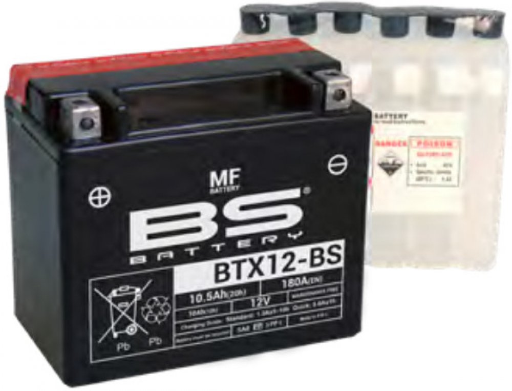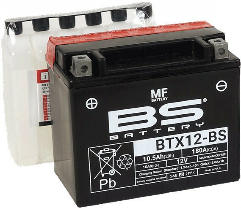 Bezúdržbový akumulátor (VRLA, AGM za sucha nabitý), značení dle normy JIS YTX12-BS, 12V 10Ah, rozměry 150x87x130 mm, BS-Battery je jedna z nejkvalitnějších baterií na trhu. Představuje efektivní alternativu k současným vedoucím značkám na trhu s vysokou úrovní kvality za dostupnou cenu. BS-Battery má mnoho vlastních patentů a tím se odlišuje od odstatních výrobců. Jedná se o Francouzskou značku s mnohaletou tradicí. V nezávislých testech se tyto baterie pravidelně umisťují na nejvyšších příčkách. O bezúdržbové akumulátory je také třeba pečovat. Pokud motocykl delší dobu stojí 1-2x měsíčně se doporučuje nabít akumulátor správnou nabíječkou. Pravidelné dobíjení prodlužuje životnost akumulátoru.
